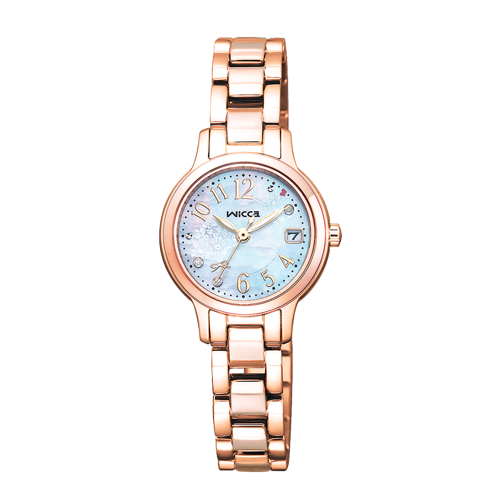 Citizen Wicca Limited Model KH4-963-91 - ladies watch produced by Citizen. It has Japanese solar quartz movement and E011 calibre. Stainless steel, gold plated case of round shape. Case dimensions are 24 mm. in diameter and 7.2 mm. in thickness. The dial of this Citizen watch is mother of pearl. Display type: analog. This timepiece has mineral glass. Stainless steel, gold plated band, band color: gold. 50 m. water resistance. The watch is from Wicca collection. The following features are equipped: glowing hands, crystal set, date, limited edition.