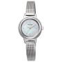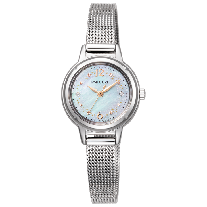 Citizen Wicca Limited Model KP3-619-21 - ladies watch produced by Citizen. It has Japanese solar quartz movement and E031 calibre. Stainless steel case of round shape. Case dimensions are 24 mm. in diameter and 7.1 mm. in thickness. The dial of this Citizen watch is mother of pearl. Display type: analog. This timepiece has mineral glass. Stainless steel band, band color: silver. 50 m. water resistance. The watch is from Wicca collection. The following features are equipped: crystal set.