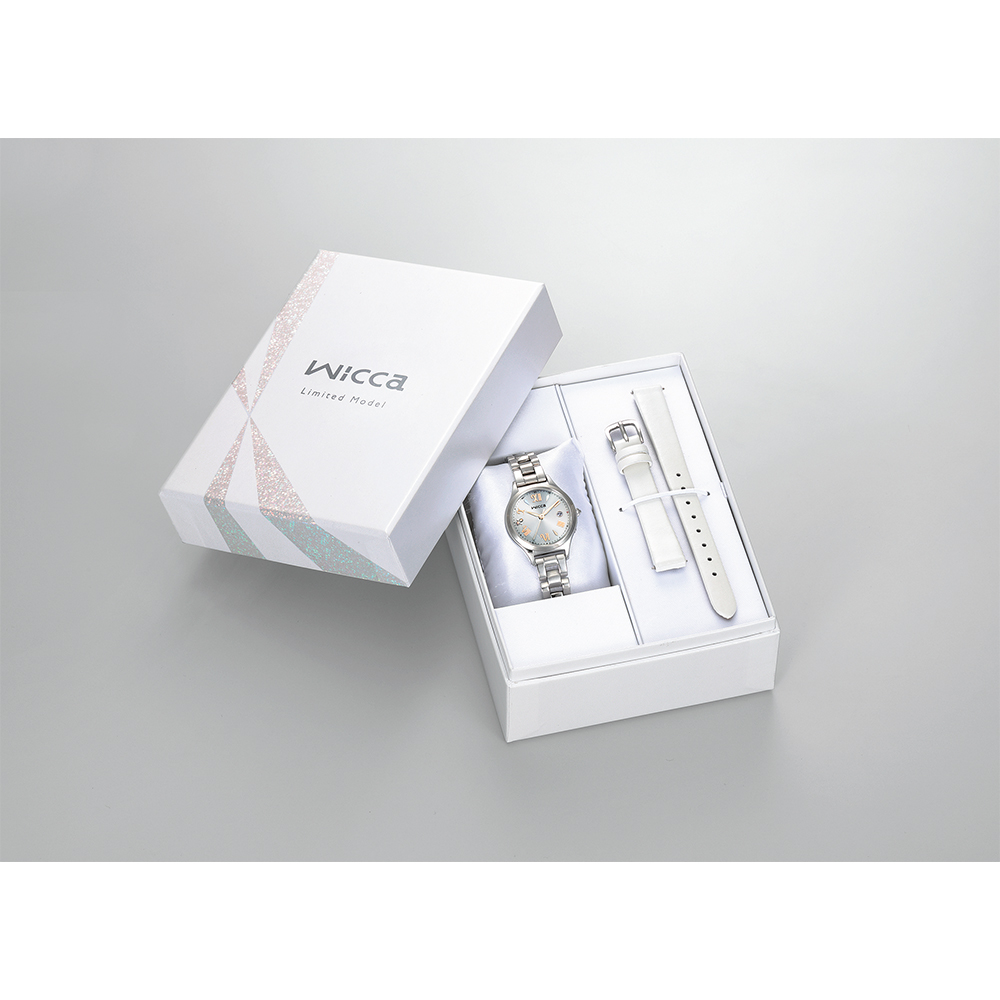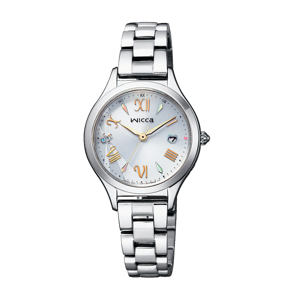 Citizen Wicca Limited Model KS1-210-11 - ladies watch made by Citizen. It is equipped with Japanese solar quartz movement and H0F6 calibre. Stainless steel case of round shape. Case dimensions are 28 mm. in diameter and 8.3 mm. in thickness. The dial of this Citizen watch is silver. Display type: analog. This timepiece has mineral glass. Stainless steel, leather band, band color: silver, white. 50 m. water resistance. The watch is from Wicca collection. The following features are equipped: date, crystal set, glowing hands, limited edition, radio controlled, perpetual calendar.