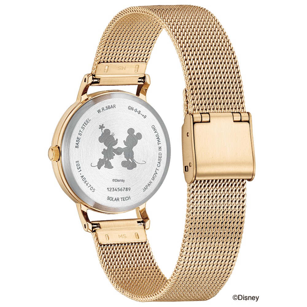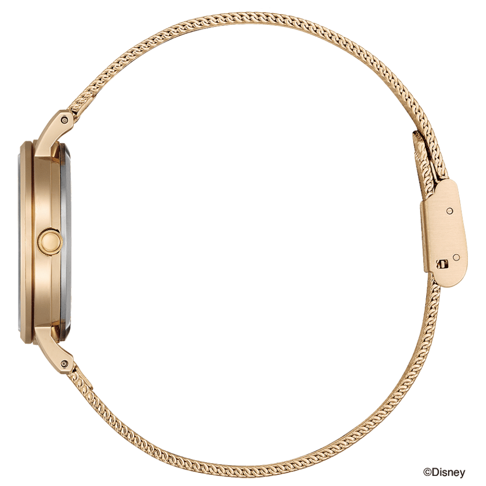 Citizen Wicca Mickey and Minnie Limited Model KP5-425-91 - ladies watch manufactured by Citizen. It is equipped with Japanese solar quartz movement and E031 calibre. Stainless steel, gold plated case of round shape. Case dimensions are 30.2 mm. in diameter and 7.5 mm. in thickness. The dial of this Citizen watch is ivory. Display type: analog. This timepiece has mineral glass. Stainless steel, gold plated band, band color: gold. 50 m. water resistance. The watch is from Wicca collection.