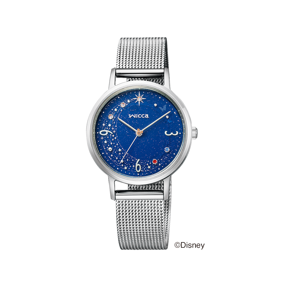 Citizen Wicca Walt Disney's Fantasia Limited Model KP5-417-71 - ladies watch made by Citizen. It has Japanese solar quartz movement and E031 calibre. Stainless steel case of round shape. Case dimensions are 30.2 mm. in diameter and 7.5 mm. in thickness. The dial of this Citizen watch is blue. Display type: analog. This timepiece has mineral glass. Stainless steel band, band color: silver. 50 m. water resistance. The watch is from Wicca collection. The following features are equipped: crystal set, limited edition.