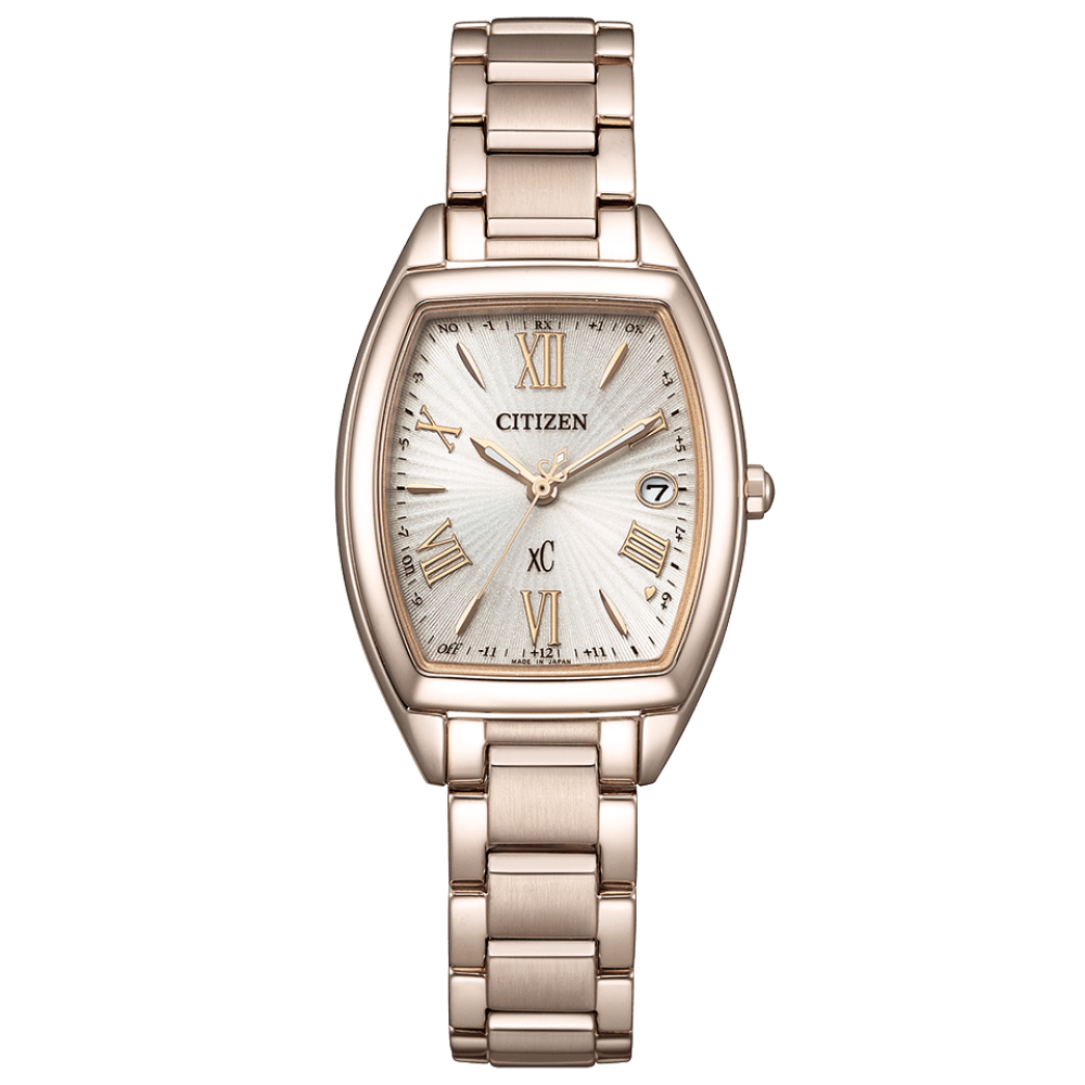 Citizen xC basic collection ES9395-53A - ladies watch produced by Citizen. It has Japanese solar quartz movement and H060 calibre. Stainless steel, duratect sakura pink case of tonneau shape. Case dimensions are 26 mm. in diameter and 7.4 mm. in thickness. The dial of this Citizen watch is silver. Display type: analog. This timepiece has sapphire, antireflection coating glass. Stainless steel, duratect sakura pink band, band color: gold. 50 m. water resistance. The watch is from xC collection. The following features are equipped: radio controlled, antimagnetic, glowing hands, power reserve indicator, perpetual calendar, date, world time.