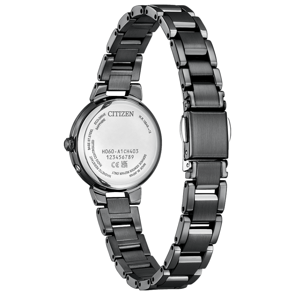 Citizen xC Basic Collection Limited Edition ES9435-69E - ladies watch produced by Citizen. It has Japanese solar quartz movement and H060 calibre. Stainless steel, duratect dlc case of round shape. Case dimensions are 25 mm. in diameter and 7.2 mm. in thickness. The dial of this Citizen watch is black. Display type: analog. This timepiece has sapphire, antireflection coating glass. Stainless steel, duratect dlc band, band color: black. 100 m. water resistance. The watch is from xC collection. The following features are equipped: antimagnetic, glowing hands, date, radio controlled, power reserve indicator, world time, limited edition.