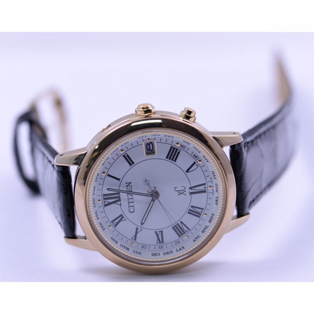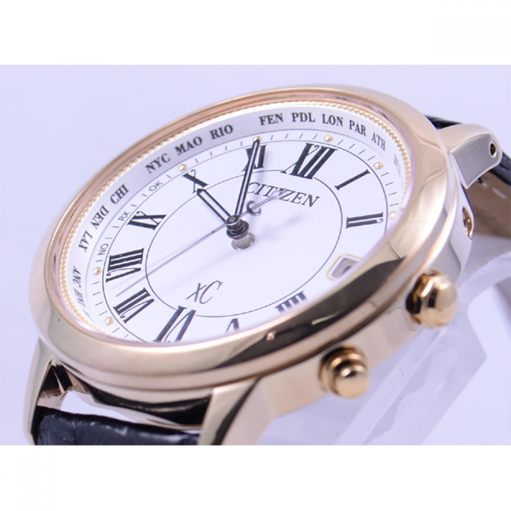 CITIZEN XC CB1103-08A - ladies watch produced by Citizen. It has Japanese solar quartz movement and H149 calibre. Titanium, gold plated case of round shape. Case dimensions are 36 mm. in diameter and 9.6 mm. in thickness. The dial of this Citizen watch is white. Display type: analog. This timepiece has sapphire, antireflection coating glass. Crocodile leather band, band color: black. 50 m. water resistance. The watch is from xC collection. The following features are equipped: radio controlled, date, world time, perpetual calendar, antimagnetic, glowing hands.