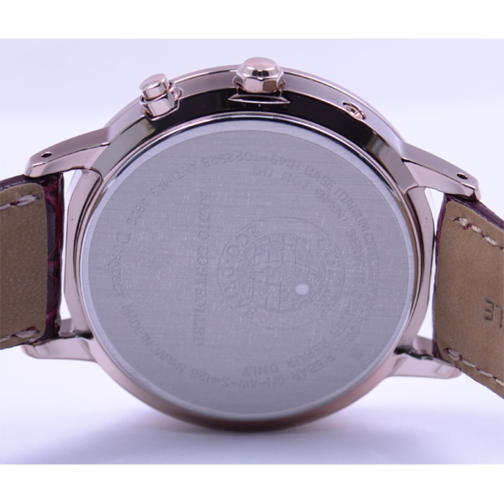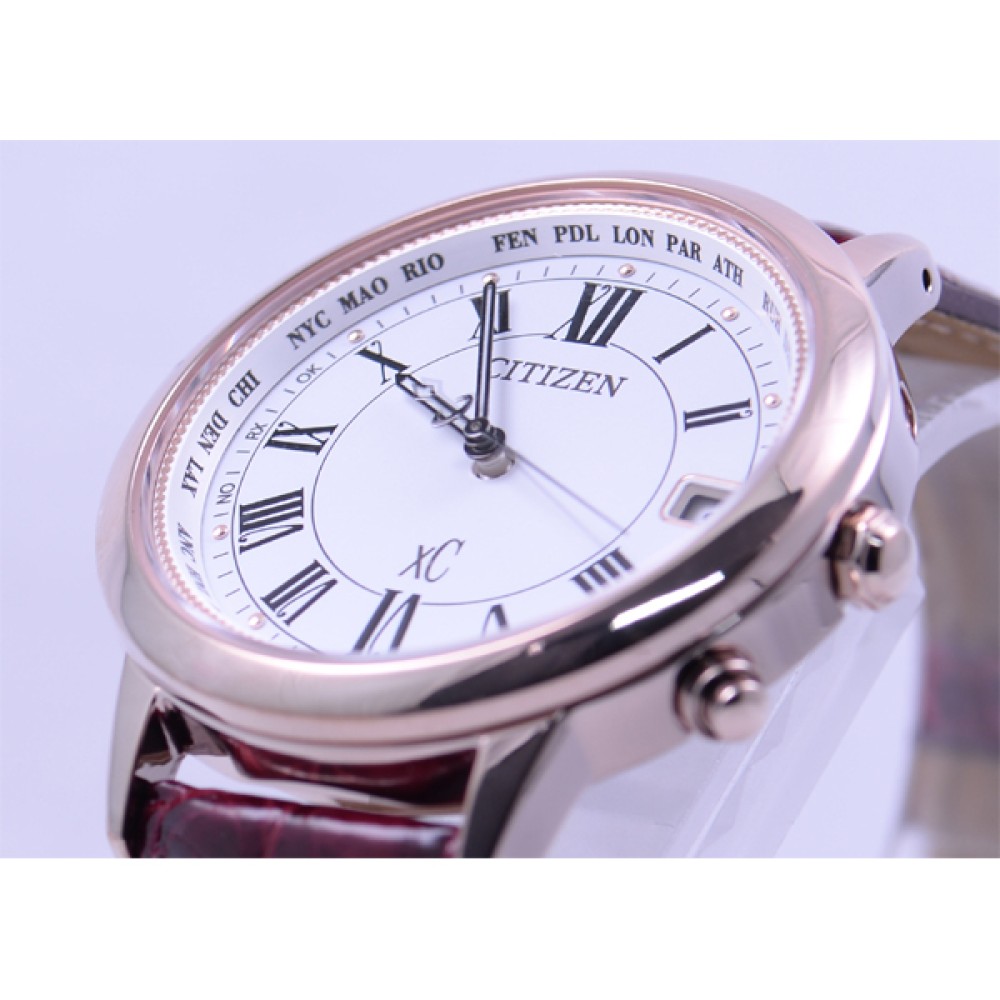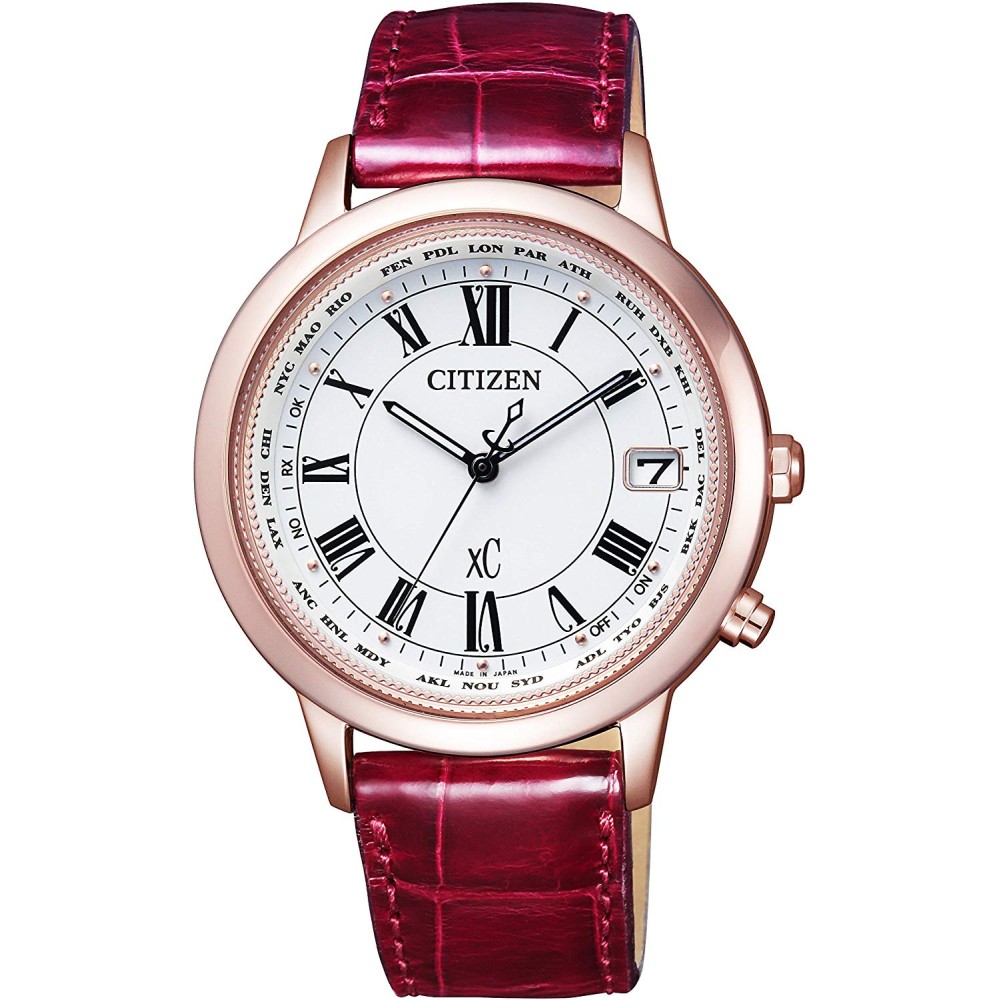 CITIZEN XC CB1104-05A - ladies watch made by Citizen. It has Japanese solar quartz movement and H149 calibre. Titanium, gold plated case of round shape. Case dimensions are 36 mm. in diameter and 9.6 mm. in thickness. The dial of this Citizen watch is white. Display type: analog. This timepiece has sapphire, antireflection coating glass. Crocodile leather band, band color: red. 50 m. water resistance. The watch is from xC collection. The following features are equipped: radio controlled, date, antimagnetic, perpetual calendar, world time, glowing hands.