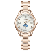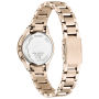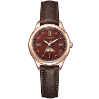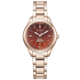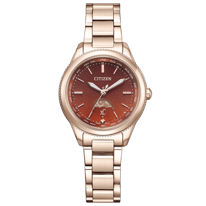 Citizen xC Daichi Collection EE1004-73W - ladies watch made by Citizen. It is equipped with Japanese solar quartz movement and H296 calibre. Super titanium, duratect sakura pink case of round shape. Case dimensions are 29 mm. in diameter and 8.8 mm. in thickness. The dial of this Citizen watch is brown. Display type: analog. This timepiece has sapphire, antireflection coating glass. Super titanium, duratect sakura pink band, band color: gold. 50 m. water resistance. The watch is from xC collection. The following features are equipped: radio controlled, antimagnetic, glowing hands, power reserve indicator, world time.