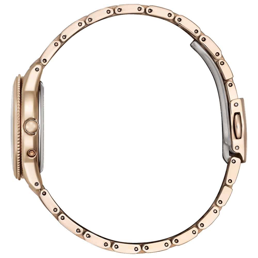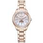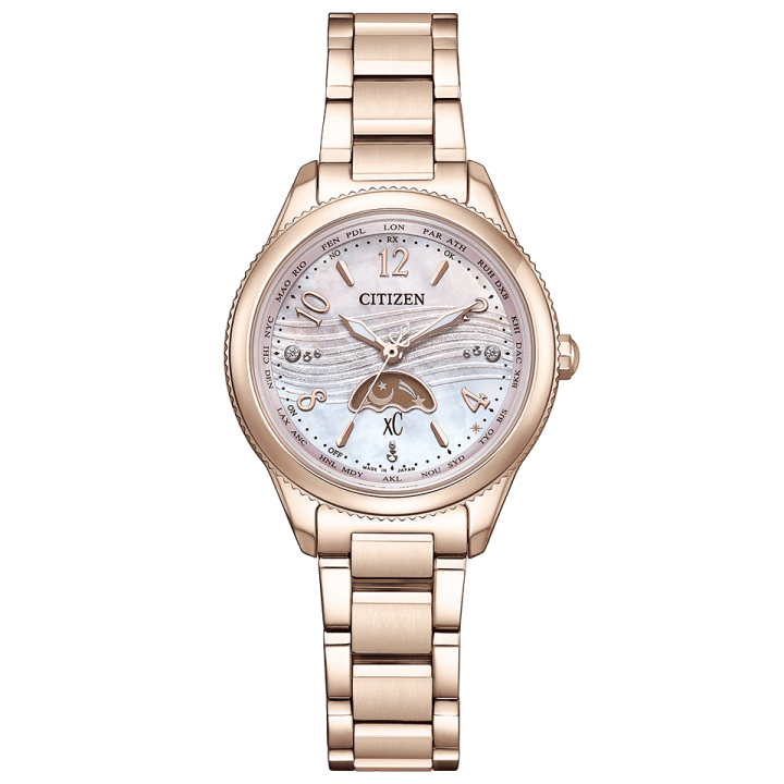 Citizen xC Daichi Collection Limited Edition EE1004-65N - ladies watch made by Citizen. It has Japanese solar quartz movement and H296 calibre. Super titanium, duratect sakura pink case of round shape. Case dimensions are 29 mm. in diameter and 8.8 mm. in thickness. The dial of this Citizen watch is mother of pearl. Display type: analog. This timepiece has sapphire, antireflection coating glass. Super titanium, duratect sakura pink band, band color: gold. 50 m. water resistance. The watch is from xC collection. The following features are equipped: radio controlled, antimagnetic, diamond set, glowing hands, power reserve indicator, world time, limited edition.