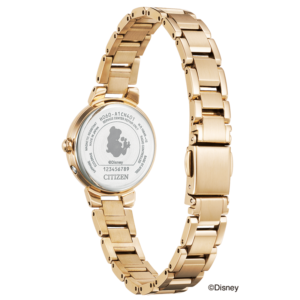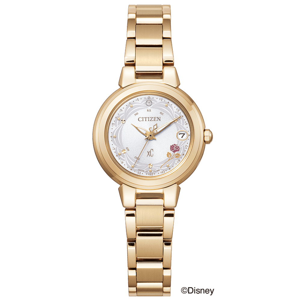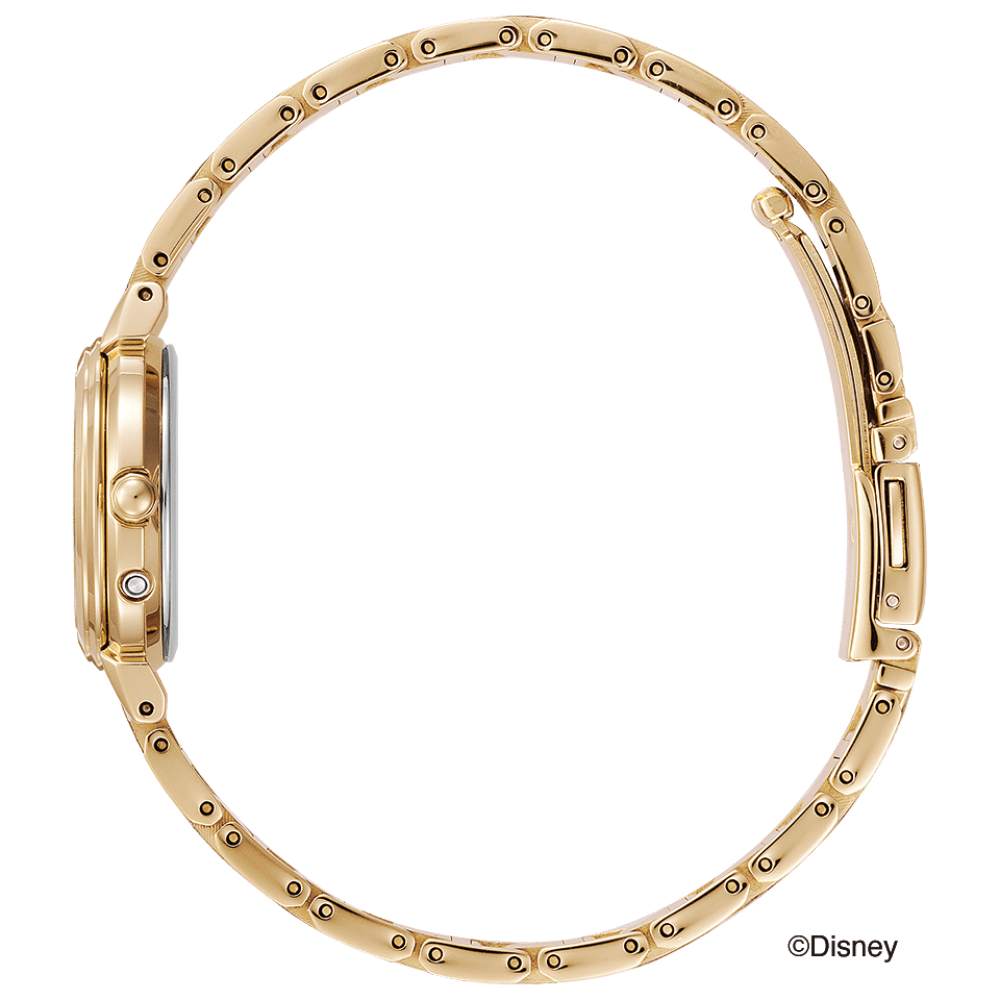 Citizen xC Disney Collection Limited Edition ES9432-67A - ladies watch manufactured by Citizen. It is equipped with Japanese solar quartz movement and H060 calibre. Stainless steel, gold plated case of round shape. Case dimensions are 25 mm. in diameter and 7.2 mm. in thickness. The dial of this Citizen watch is white, silver. Display type: analog. This timepiece has sapphire, antireflection coating glass. Stainless steel, gold plated band, band color: gold. 100 m. water resistance. The watch is from xC collection. The following features are equipped: radio controlled, antimagnetic, limited edition, glowing hands, diamond set, power reserve indicator, perpetual calendar, world time, date.