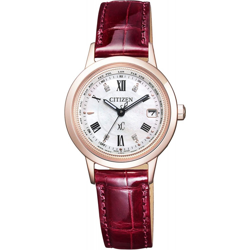 CITIZEN XC EC1144-00W - ladies watch made by Citizen. It is equipped with Japanese solar quartz movement and H246 calibre. Titanium, gold plated case of round shape. Case dimensions are 27.8 mm. in diameter and 7.7 mm. in thickness. The dial of this Citizen watch is white. Display type: analog. This timepiece has sapphire, antireflection coating glass. Crocodile leather band, band color: red. 50 m. water resistance. The watch is from xC collection. The following features are equipped: antimagnetic, date, perpetual calendar, radio controlled, world time, crystal set, limited edition, glowing hands.