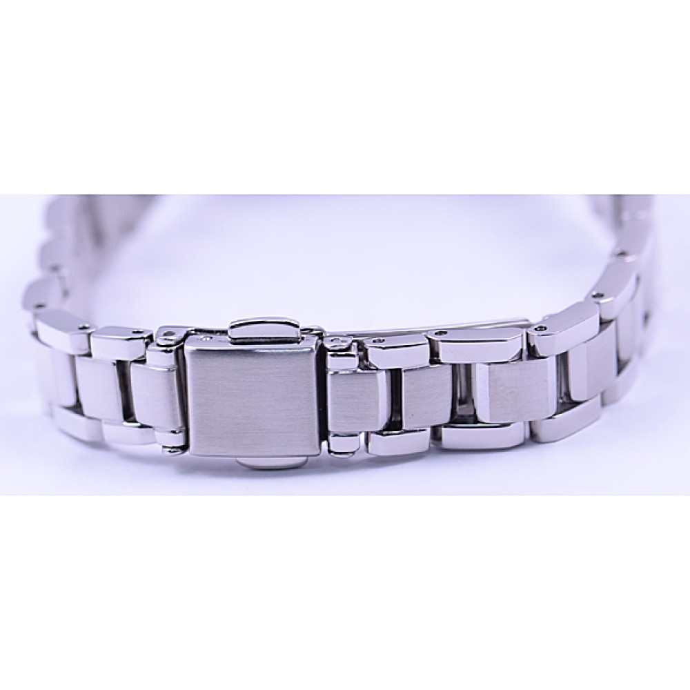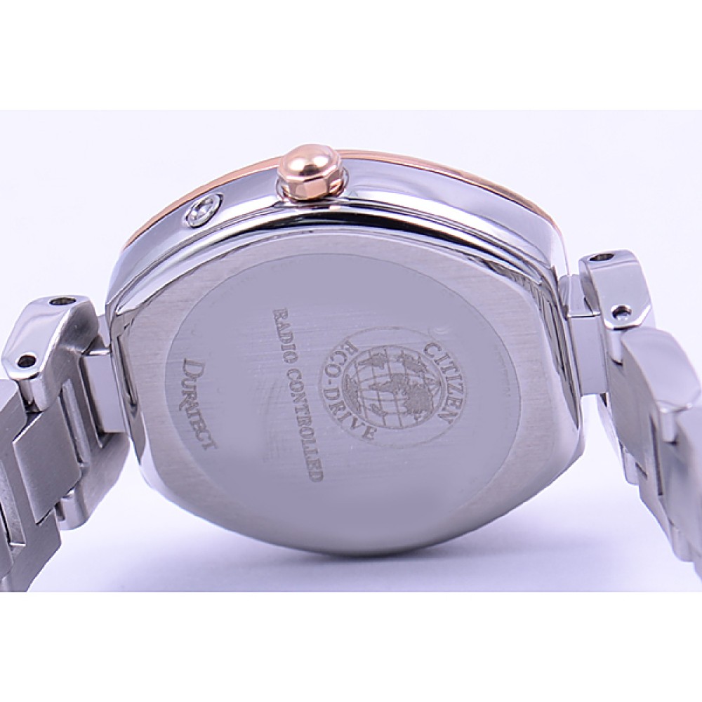 CITIZEN XC ES8055-65A - ladies watch manufactured by Citizen. It is equipped with Japanese solar quartz movement and H058 calibre. Stainless steel, hard coating, gold plated case of tonneau shape. Case dimensions are 24.4 mm. in diameter and 7.2 mm. in thickness. The dial of this Citizen watch is white, silver. Display type: analog. This timepiece has sapphire, antireflection coating glass. Stainless steel band, band color: silver. 50 m. water resistance. The watch is from xC collection. The following features are equipped: antimagnetic, date, radio controlled, perpetual calendar, glowing hands.