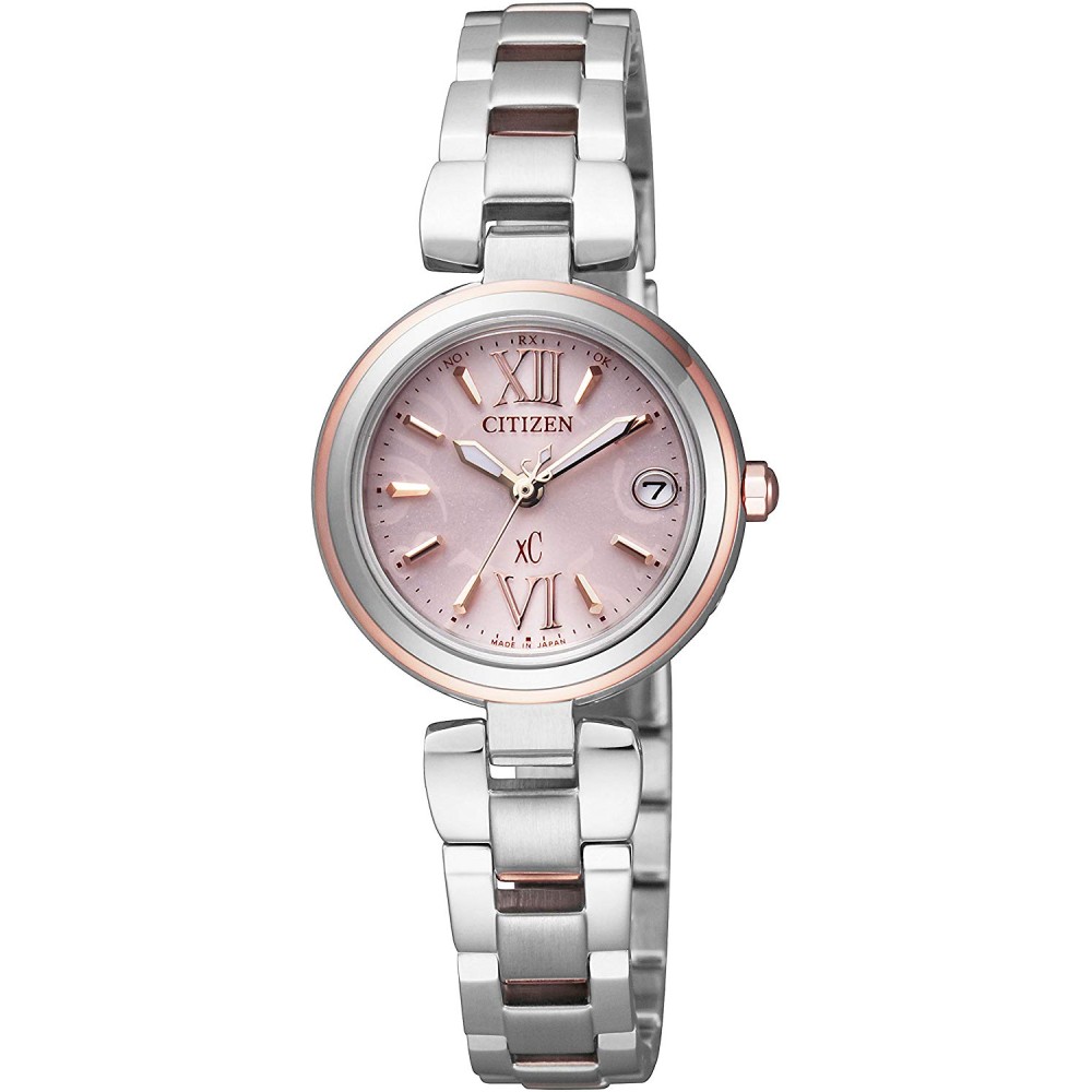 CITIZEN XC ES8134-52W - ladies watch produced by Citizen. It is equipped with Japanese solar quartz movement and H058 calibre. Stainless steel, hard coating, gold plated case of round shape. Case dimensions are 24.5 mm. in diameter and 7.2 mm. in thickness. The dial of this Citizen watch is pink. Display type: analog. This timepiece has sapphire glass. Stainless steel, hard coating, gold plated band, band color: silver, gold. 100 m. water resistance. The watch is from xC collection. The following features are equipped: antimagnetic, date, perpetual calendar, radio controlled, glowing hands.