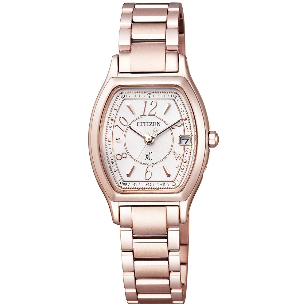 CITIZEN XC ES9354-69A - ladies watch manufactured by Citizen. It is equipped with Japanese solar quartz movement and H060 calibre. Titanium, gold plated case of tonneau shape. Case dimensions are 24.4 mm. in diameter and 8.3 mm. in thickness. The dial of this Citizen watch is white. Display type: analog. This timepiece has sapphire, antireflection coating glass. Titanium, gold plated band, band color: gold. 50 m. water resistance. The watch is from xC collection. The following features are equipped: glowing hands, perpetual calendar, radio controlled, antimagnetic, world time, date.