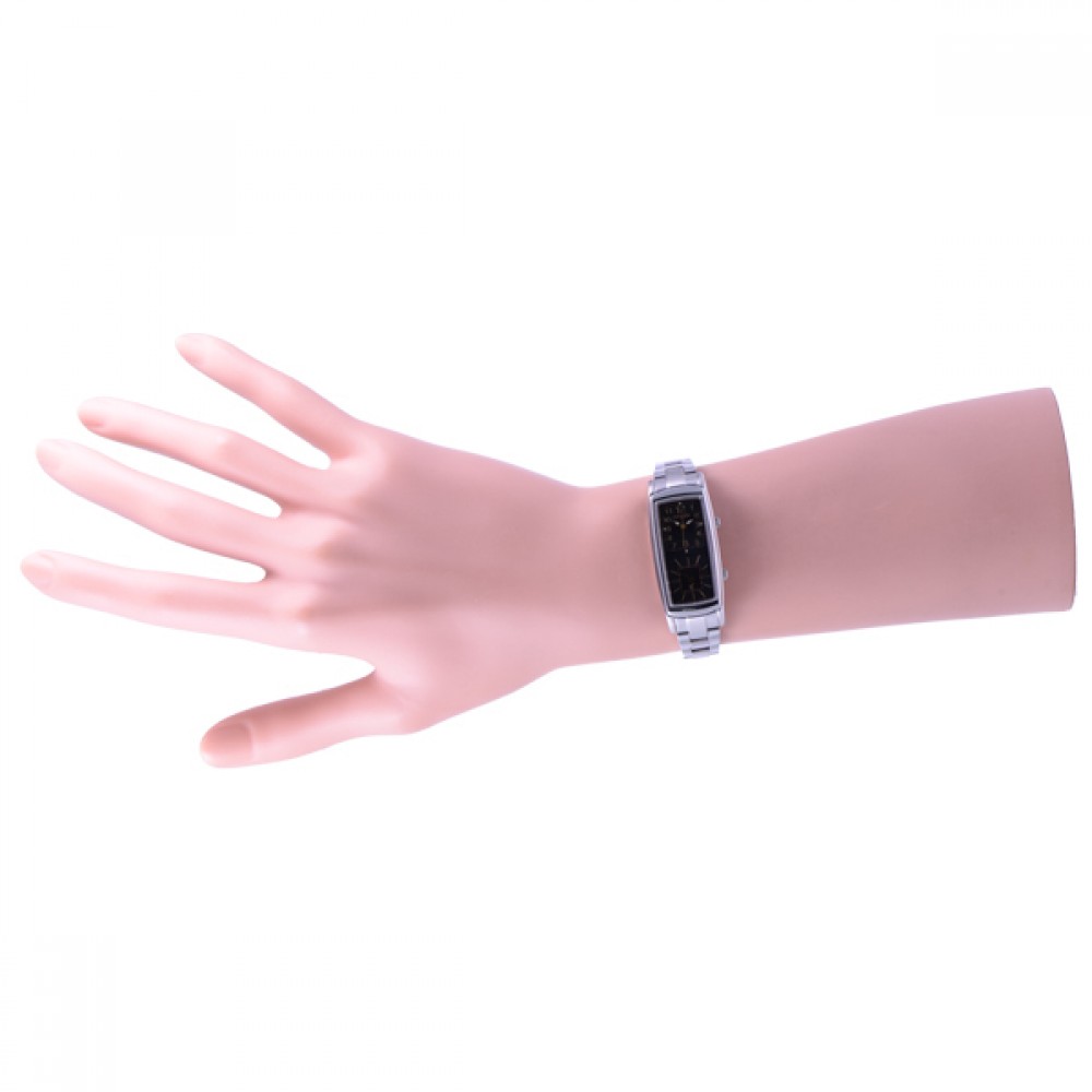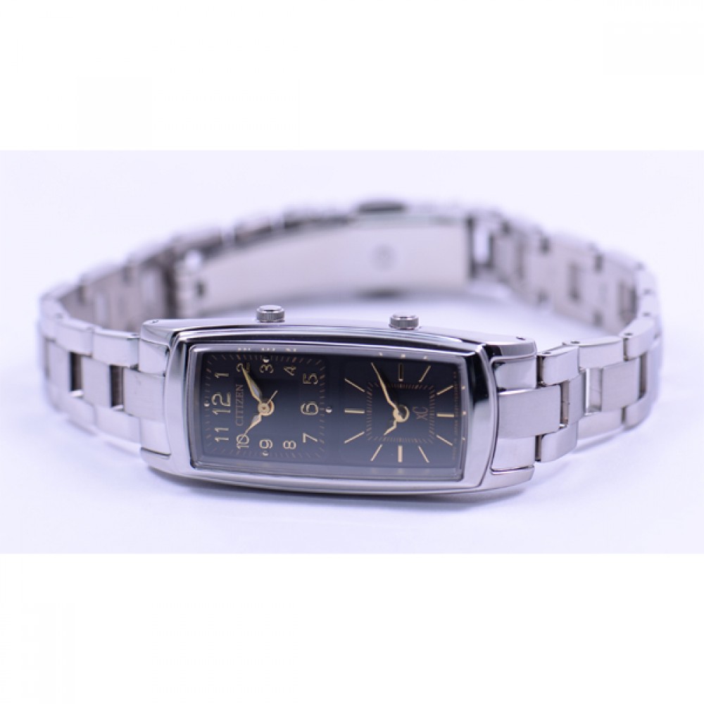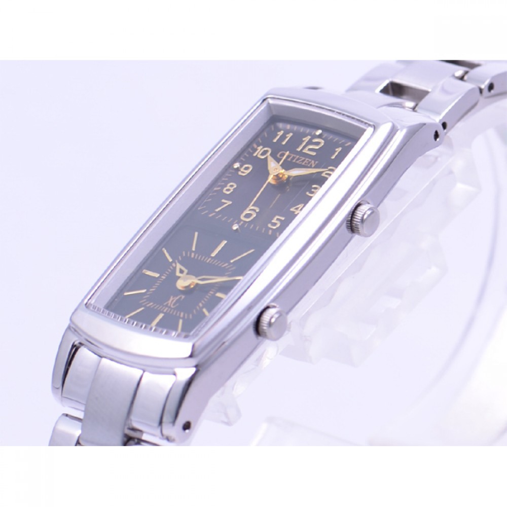 CITIZEN XC EW4000-55E - ladies watch made by Citizen. It has Japanese solar quartz movement and B03Y calibre. Stainless steel, hard coating case of tonneau shape. Case dimensions are 18.7 mm. in diameter and 6.4 mm. in thickness. The dial of this Citizen watch is black. Display type: analog. This timepiece has sapphire glass. Stainless steel, hard coating band, band color: silver. 50 m. water resistance. The watch is from xC collection. The following features are equipped: dual time, glowing hands.