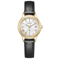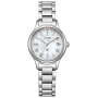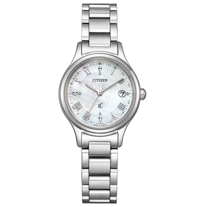 Citizen xC hikari collection ES9490-52D - ladies watch manufactured by Citizen. It has Japanese solar quartz movement and H060 calibre. Super titanium, duratect treatment case of round shape. Case dimensions are 27 mm. in diameter and 8.2 mm. in thickness. The dial of this Citizen watch is mother of pearl. Display type: analog. This timepiece has sapphire, antireflection coating glass. Super titanium band, band color: silver. 50 m. water resistance. The watch is from xC collection. The following features are equipped: radio controlled, antimagnetic, glowing hands, power reserve indicator, perpetual calendar, date, world time.
