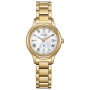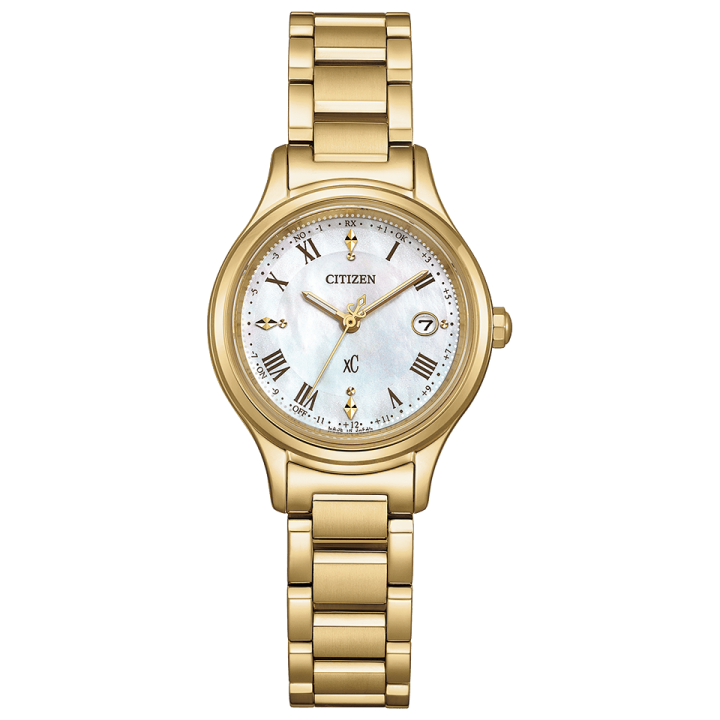 Citizen xC hikari collection ES9492-57D - ladies watch produced by Citizen. It is equipped with Japanese solar quartz movement and H060 calibre. Super titanium, duratect amber yellow case of round shape. Case dimensions are 27 mm. in diameter and 8.2 mm. in thickness. The dial of this Citizen watch is mother of pearl. Display type: analog. This timepiece has sapphire, antireflection coating glass. Super titanium, duratect amber yellow band, band color: gold. 50 m. water resistance. The watch is from xC collection. The following features are equipped: radio controlled, antimagnetic, glowing hands, power reserve indicator, perpetual calendar, date, world time.