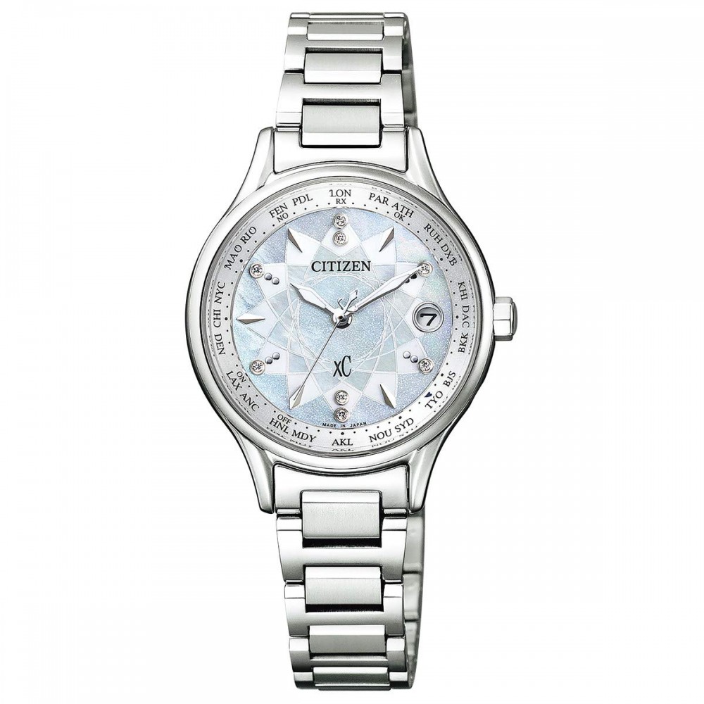 Citizen xC Limited Model EC1160-54W - lady's watch made by Citizen. It is equipped with Japanese solar quartz movement and H246 calibre. Titanium, hard coating case of round shape. Case dimensions are 28 mm. in diameter and 8.5 mm. in thickness. The dial of this Citizen watch is mother of pearl, white. Display type: analog. This timepiece has sapphire, antireflection coating glass. Titanium, hard coating band, band color: silver. 50 m. water resistance. The watch is from xC collection. The following features are equipped: antimagnetic, glowing hands, perpetual calendar, radio controlled, diamond set, limited edition, world time, date.