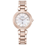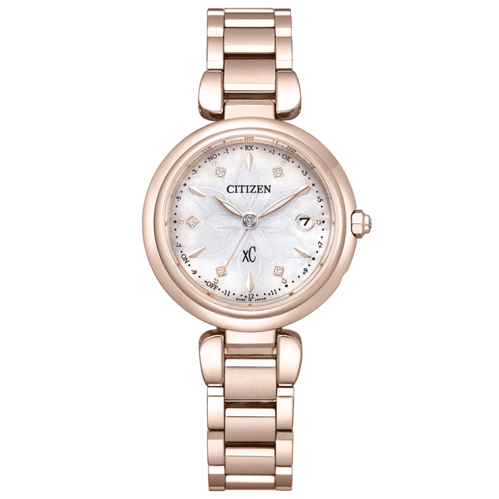 Citizen xC Mizu Collection Floret Diamond Limited Edition ES9467-71Y - ladies watch manufactured by Citizen. It is equipped with Japanese solar quartz movement and H060 calibre. Super titanium, duratect sakura pink case of round shape. Case dimensions are 29 mm. in diameter and 9.1 mm. in thickness. The dial of this Citizen watch is mother of pearl. Display type: analog. This timepiece has sapphire, antireflection coating glass. Super titanium, duratect sakura pink band, band color: gold. 50 m. water resistance. The watch is from xC collection. The following features are equipped: radio controlled, antimagnetic, diamond set, glowing hands, power reserve indicator, perpetual calendar, date, world time, limited edition.