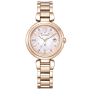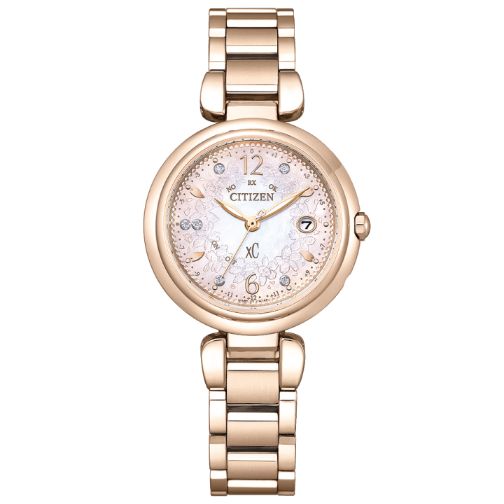 Citizen xC Mizu Collection Limited Edition ES9467-62W - ladies watch made by Citizen. It is equipped with Japanese solar quartz movement and H060 calibre. Super titanium, duratect sakura pink case of round shape. Case dimensions are 29 mm. in diameter and 8.2 mm. in thickness. The dial of this Citizen watch is mother of pearl. Display type: analog. This timepiece has sapphire, antireflection coating glass. Super titanium, duratect sakura pink band, band color: gold. 50 m. water resistance. The watch is from xC collection. The following features are equipped: glowing hands, radio controlled, antimagnetic, diamond set, date, power reserve indicator, world time, perpetual calendar, limited edition.