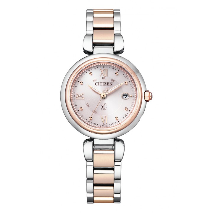 Citizen xC mizu Collection Titania Happy Flight ES9465-50W - ladies watch made by Citizen. It is equipped with Japanese solar quartz movement and H060 calibre. Titanium, gold plated, hard coating case of round shape. Case dimensions are 29 mm. in diameter and 8.2 mm. in thickness. The dial of this Citizen watch is pink. Display type: analog. This timepiece has sapphire, antireflection coating glass. Titanium, gold plated, hard coating band, band color: gold, silver. 50 m. water resistance. The watch is from xC collection. The following features are equipped: radio controlled, glowing hands, perpetual calendar, antimagnetic, world time, date, power reserve indicator.