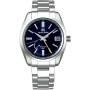Grand Seiko Heritage SBGE281 - men's watch produced by Seiko. It is equipped with Japanese spring drive movement and 9R66 calibre. Stainless steel case of round shape. Case dimensions are 40 mm. in diameter and 13.5 mm. in thickness. The dial of this Grand Seiko watch is midnight blue. Display type: analog. This timepiece has sapphire, antireflection coating glass. Stainless steel band, band color: silver. 100 m. water resistance. The watch is from Heritage collection. The following features are equipped: antimagnetic, dual time, screw-down crown, date, power reserve indicator.