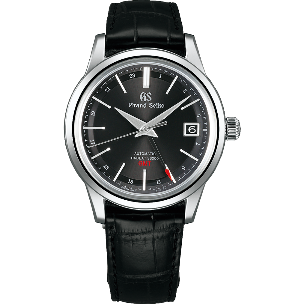 Grand Seiko SBGJ219 - men's watch produced by Seiko. It is equipped with Japanese automatic movement and 9S86 calibre. Stainless steel case of round shape. Case dimensions are 39.5 mm. in diameter and 13.9 mm. in thickness. The dial of this Grand Seiko watch is black. Display type: analog. This timepiece has sapphire, antireflection coating glass. Crocodile leather band, band color: black. 30 m. water resistance. The watch is from Grand Seiko Elegance collection. The following features are equipped: antimagnetic, date, dual time, limited edition.