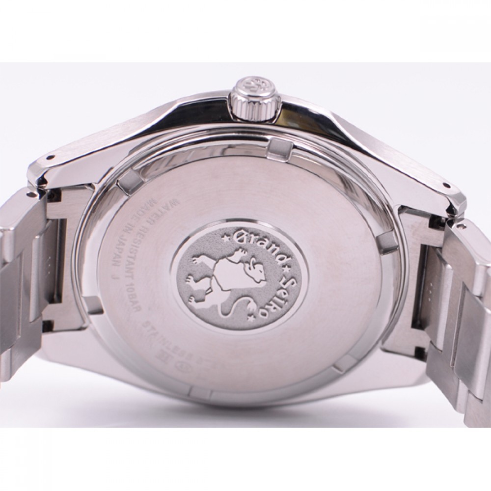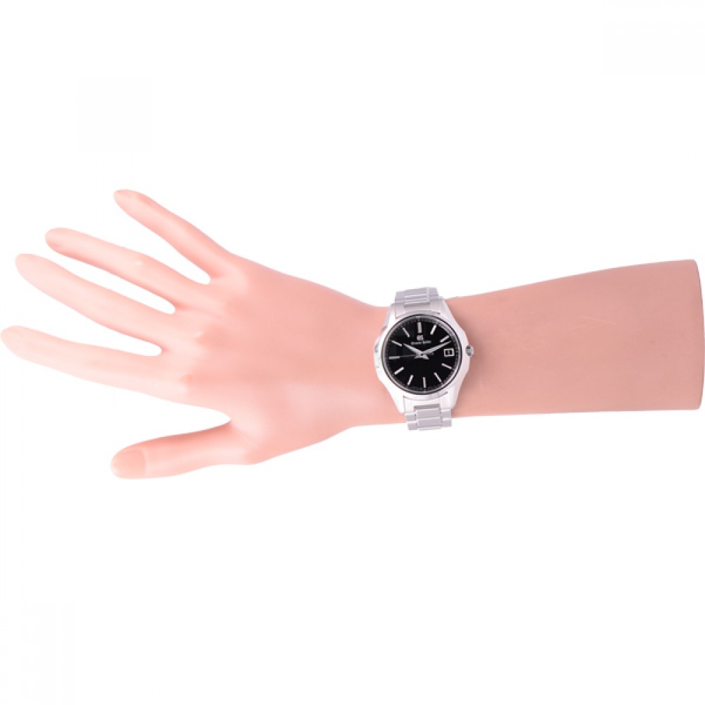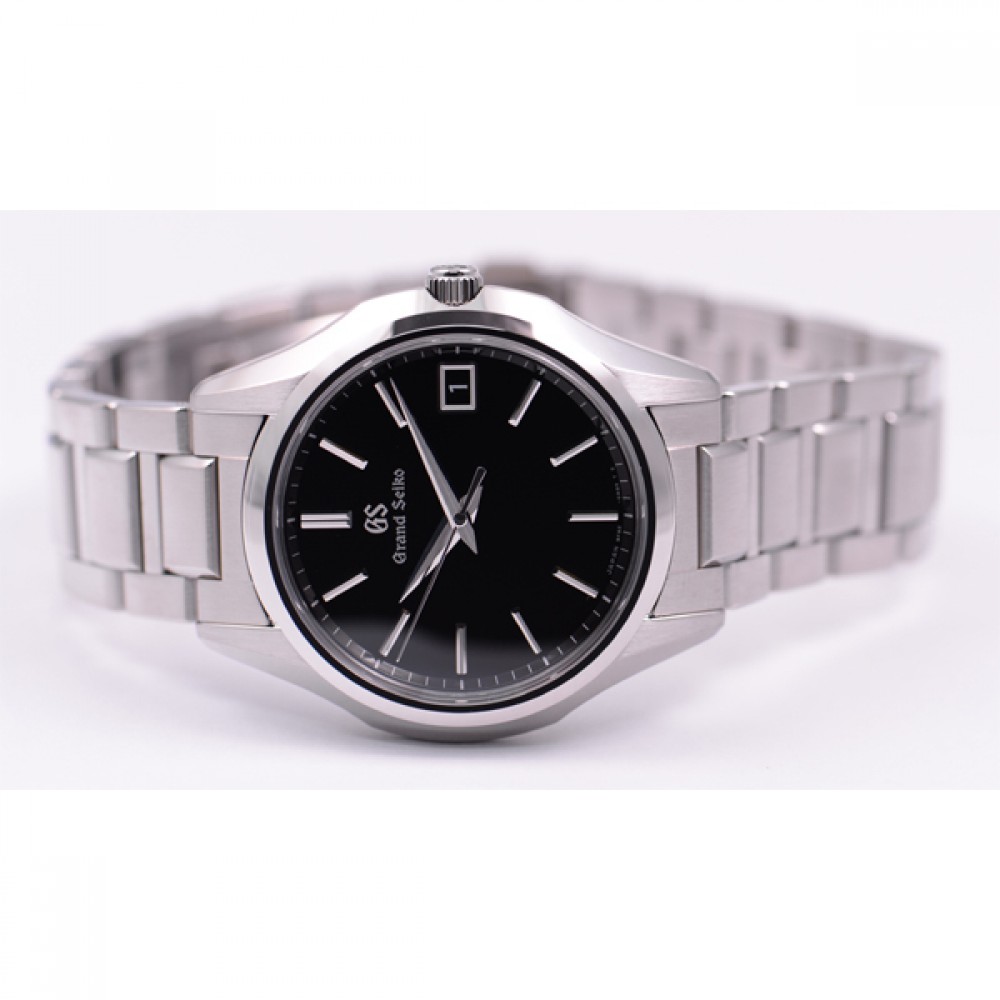 Grand Seiko SBGV215 - men's watch produced by Seiko. It has Japanese quartz movement and 9F82 calibre. Stainless steel case of round shape. Case dimensions are 39 mm. in diameter and 10.4 mm. in thickness. The dial of this Grand Seiko watch is black. Display type: analog. This timepiece has sapphire, antireflection coating glass. Stainless steel band, band color: silver. 100 m. water resistance. The watch is from Heritage collection. The following features are equipped: antimagnetic, date.
