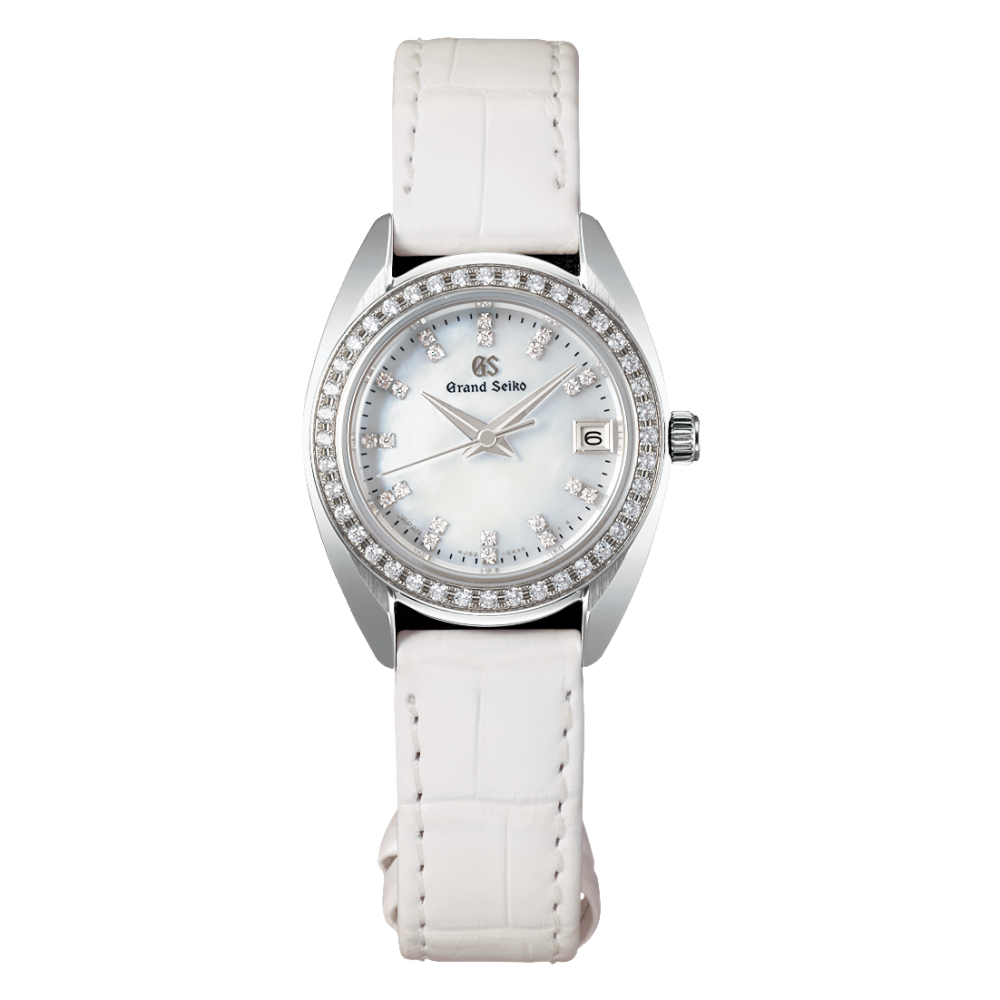 Grand Seiko STGF291 - ladies watch manufactured by Seiko. It has Japanese quartz movement and 4J52 calibre. case of round shape. Case dimensions are 26 mm. in diameter and 9.1 mm. in thickness. The dial of this Grand Seiko watch is white. Display type: analog. This timepiece has sapphire, antireflection coating glass. Crocodile leather band, band color: white. 100 m. water resistance. The watch is from Grand Seiko Elegance collection. The following features are equipped: antimagnetic, date, diamond set, limited edition.