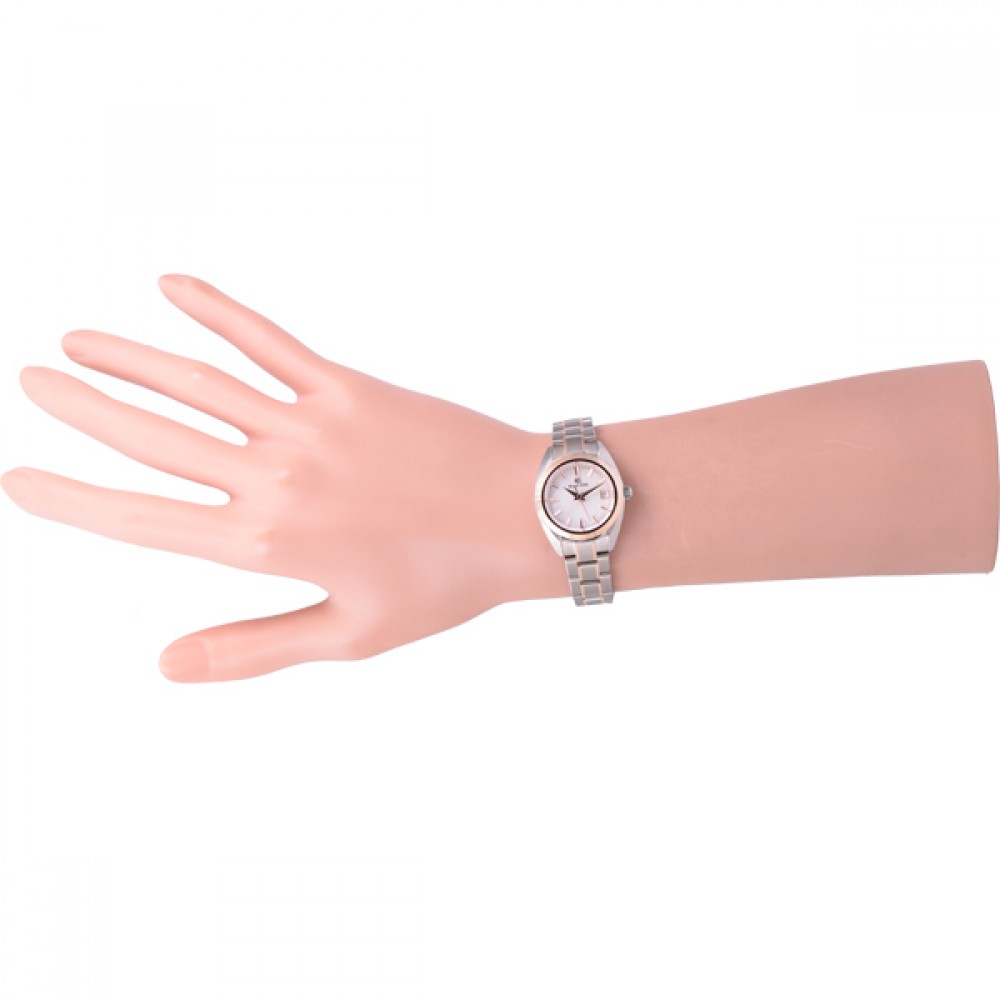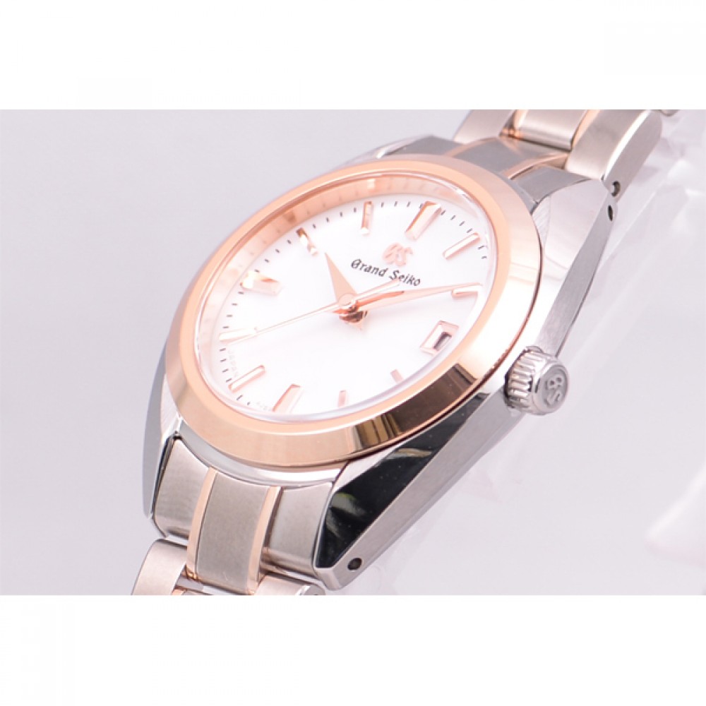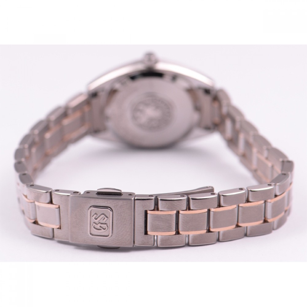 Grand Seiko STGF310 - ladies watch made by Seiko. It has Japanese quartz movement and 4J52 calibre. Titanium, gold case of round shape. Case dimensions are 26 mm. in diameter and 9 mm. in thickness. The dial of this Grand Seiko watch is white. Display type: analog. This timepiece has sapphire, antireflection coating glass. Titanium, gold band, band color: silver, gold. 100 m. water resistance. The watch is from Grand Seiko Elegance collection. The following features are equipped: date, antimagnetic.