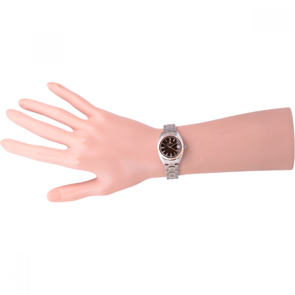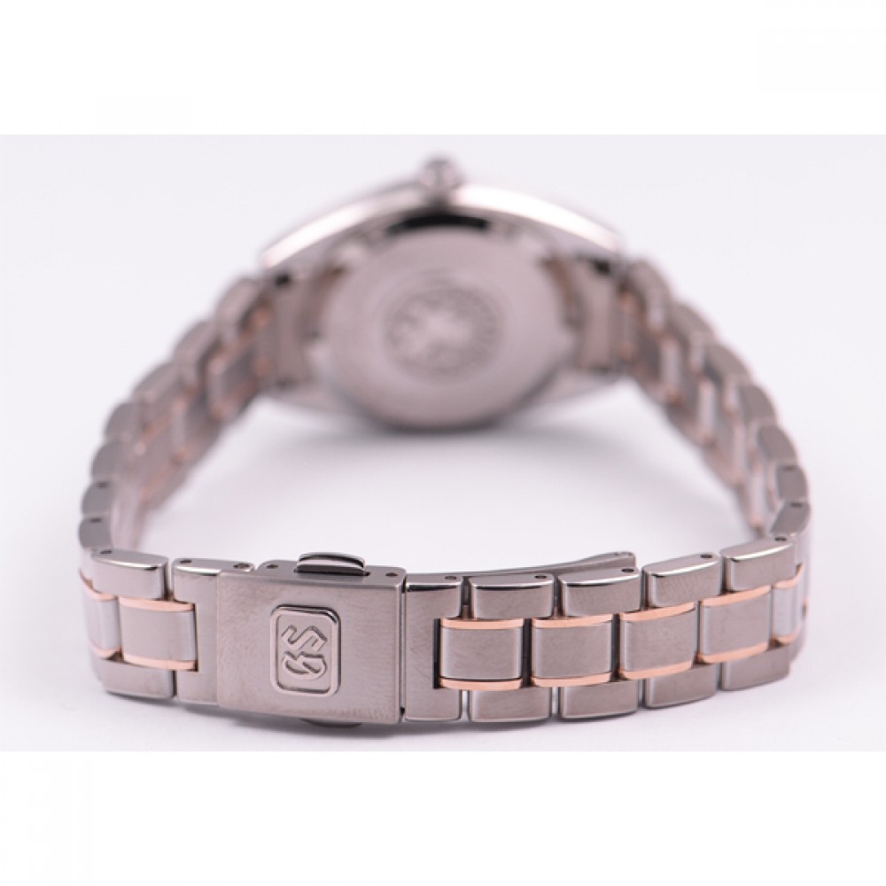 Grand Seiko STGF312 - ladies watch manufactured by Seiko. It is equipped with Japanese quartz movement and 4J52 calibre. Titanium, gold case of round shape. Case dimensions are 26 mm. in diameter and 9 mm. in thickness. The dial of this Grand Seiko watch is brown. Display type: analog. This timepiece has sapphire, antireflection coating glass. Titanium, gold band, band color: silver, gold. 100 m. water resistance. The watch is from Grand Seiko Elegance collection. The following features are equipped: antimagnetic, date.