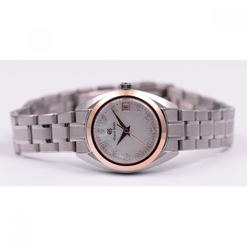 Grand Seiko STGF316 - ladies watch made by Seiko. It has Japanese quartz movement and 4J52 calibre. Titanium, gold case of round shape. Case dimensions are 26 mm. in diameter and 9 mm. in thickness. The dial of this Grand Seiko watch is white. Display type: analog. This timepiece has sapphire, antireflection coating glass. Titanium band, band color: silver. 100 m. water resistance. The watch is from Grand Seiko Elegance collection. The following features are equipped: antimagnetic, date, diamond set.