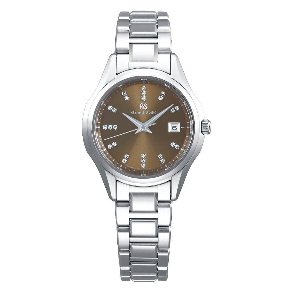 Grand Seiko STGF327 - ladies watch produced by Seiko. It is equipped with Japanese quartz movement and 4J52 calibre. Stainless steel case of round shape. Case dimensions are 29.5 mm. in diameter and 8.5 mm. in thickness. The dial of this Grand Seiko watch is brown. Display type: analog. This timepiece has sapphire, antireflection coating glass. Stainless steel band, band color: silver. 100 m. water resistance. The watch is from Heritage collection. The following features are equipped: antimagnetic, date, diamond set.