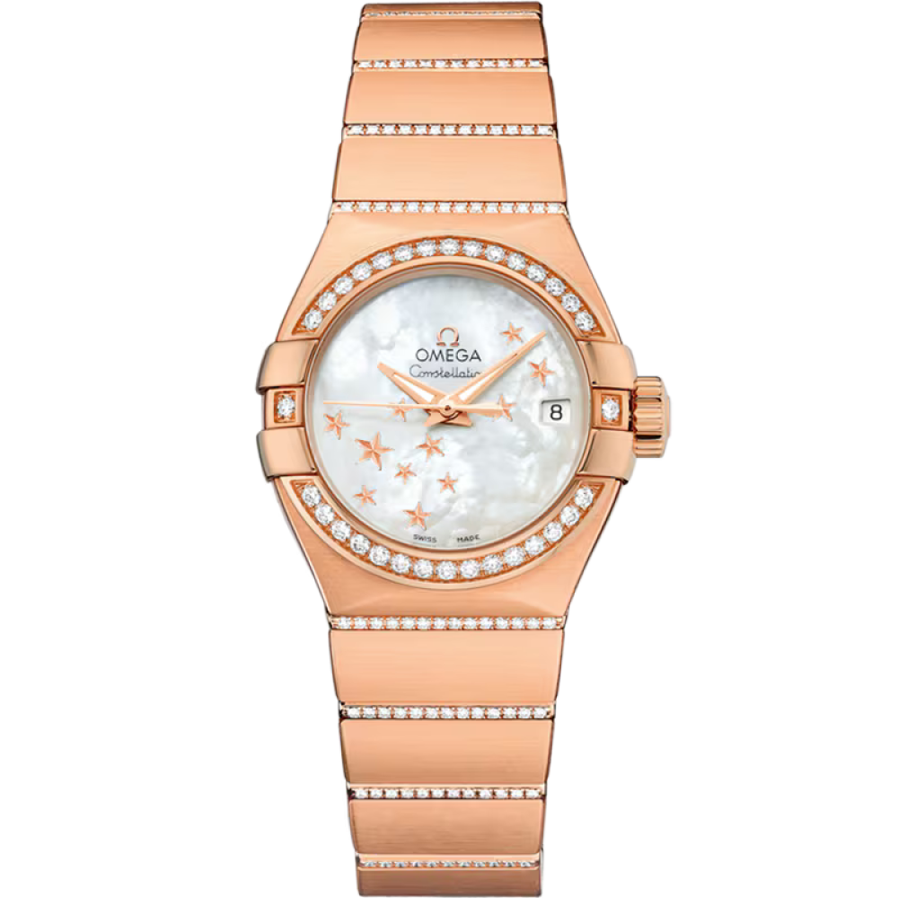 Omega Constellation Co-Axial Chronometer 27 mm 123.55.27.20.05.004 - ladies watch produced by Omega. It has Japanese automatic movement and Omega 8521 calibre. 18k red gold case of round shape. Case dimensions are 27 mm. in diameter and 12.25 mm. in thickness. The dial of this Omega watch is mother of pearl. Display type: analog. This timepiece has sapphire, antireflection coating glass. 18k red gold band, band color: gold. 100 m. water resistance. The watch is from Constellation collection. The following features are equipped: glowing hands, diamond set, date, chronometer.