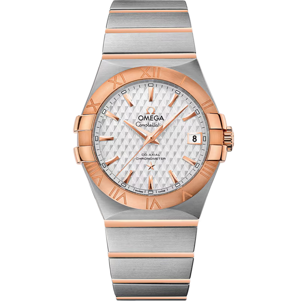Omega Constellation Co-Axial Chronometer 35 mm 123.20.35.20.02.005 - men's watch produced by Omega. It is equipped with Japanese automatic movement and OMEGA 2500 calibre. Stainless steel, 18k pink gold case of round shape. Case dimensions are 35 mm. in diameter and 10.76 mm. in thickness. The dial of this Omega watch is silver. Display type: analog. This timepiece has sapphire, antireflection coating glass. Stainless steel, 18k pink gold band, band color: silver, gold. 100 m. water resistance. The watch is from Constellation collection. The following features are equipped: glowing hands, glowing markers, chronometer, date.