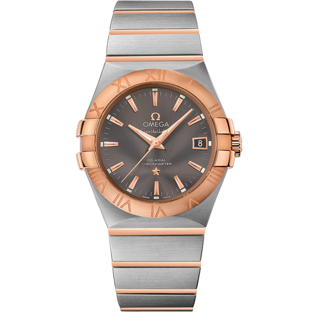 Omega Constellation Co-Axial Chronometer 35 mm 123.20.35.20.06.002 - men's watch made by Omega. It has Japanese automatic movement and OMEGA 2500 calibre. Stainless steel, 18k red gold case of round shape. Case dimensions are 35 mm. in diameter and 10.76 mm. in thickness. The dial of this Omega watch is gray. Display type: analog. This timepiece has sapphire, antireflection coating glass. Stainless steel, 18k red gold band, band color: silver, gold. 100 m. water resistance. The watch is from Constellation collection. The following features are equipped: glowing hands, glowing markers, chronometer, date.