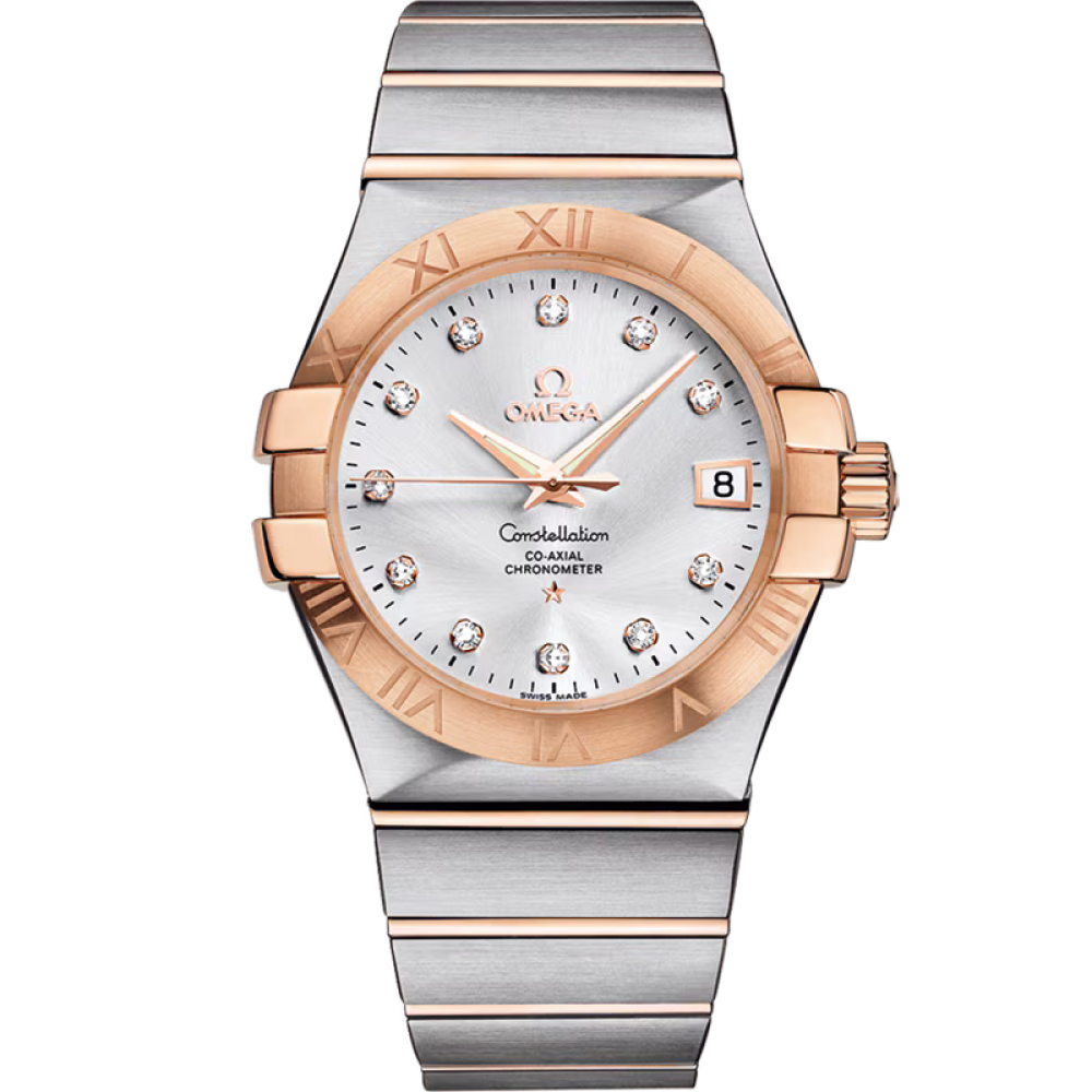 Omega Constellation Co-Axial Chronometer 35 mm 123.20.35.20.52.001 - men's watch produced by Omega. It is equipped with Japanese automatic movement and OMEGA 2500 calibre. Stainless steel, 18k pink gold case of round shape. Case dimensions are 35 mm. in diameter and 10.76 mm. in thickness. The dial of this Omega watch is silver. Display type: analog. This timepiece has sapphire, antireflection coating glass. Stainless steel, 18k pink gold band, band color: silver, gold. 100 m. water resistance. The watch is from Constellation collection. The following features are equipped: glowing hands, chronometer, date, diamond set.