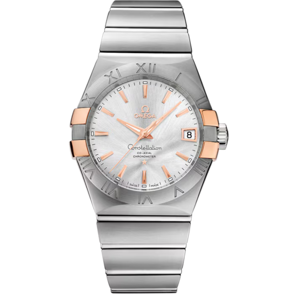 Omega Constellation Co-Axial Chronometer 38 mm 123.20.38.21.02.004 - men's watch produced by Omega. It is equipped with Japanese automatic movement and Omega 8500 calibre. Stainless steel, 18k red gold case of round shape. Case dimensions are 38 mm. in diameter and 12.52 mm. in thickness. The dial of this Omega watch is silver. Display type: analog. This timepiece has sapphire, antireflection coating glass. Stainless steel band, band color: silver. 100 m. water resistance. The watch is from Constellation collection. The following features are equipped: date, glowing hands, chronometer, glowing markers.