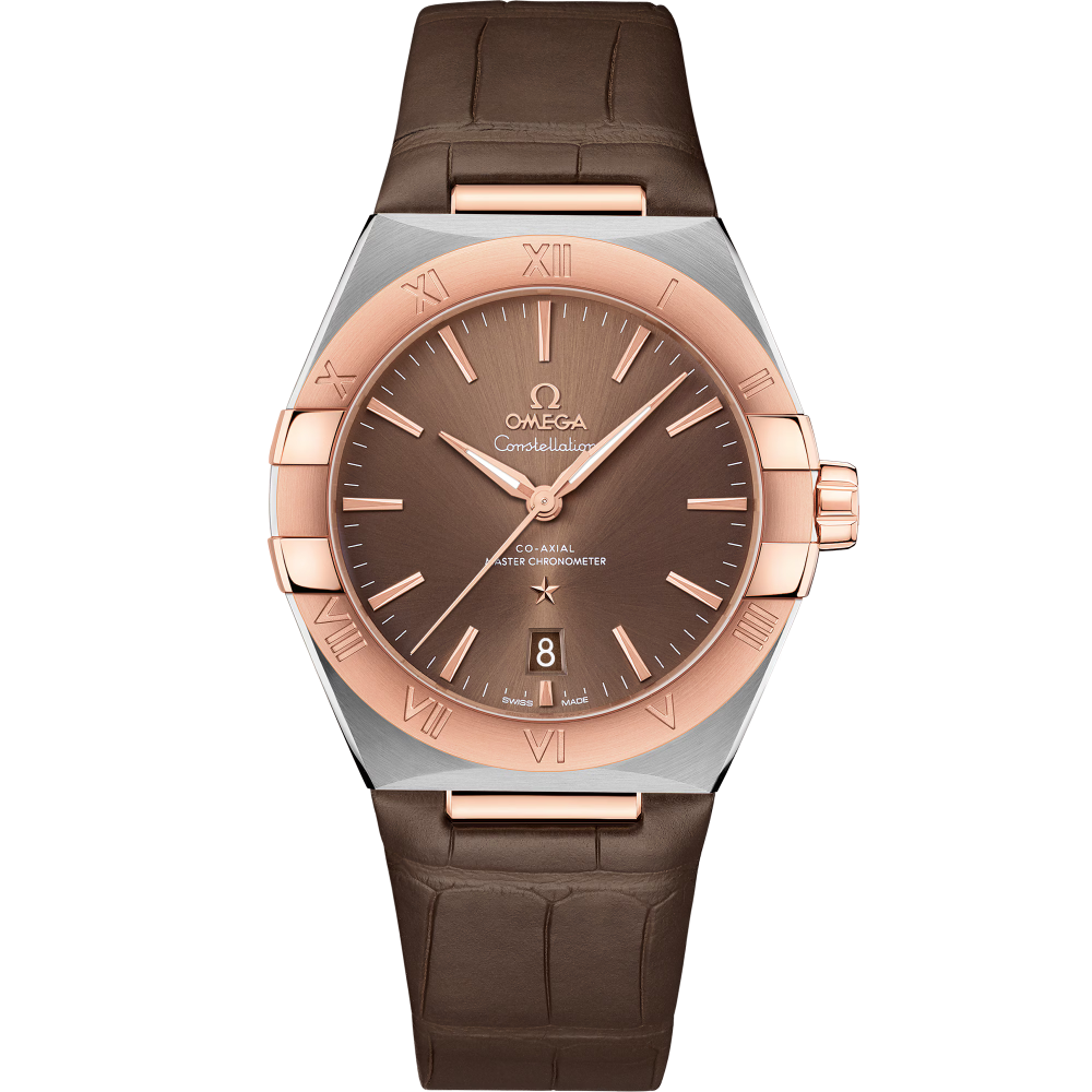 Omega Constellation Co-Axial Master Chronometer 39 mm 131.23.39.20.13.001 - men's watch produced by Omega. It has Japanese automatic movement and Omega 8800 calibre. Stainless steel, 18k sedna™ gold case of round shape. Case dimensions are 39 mm. in diameter and 12.43 mm. in thickness. The dial of this Omega watch is brown. Display type: analog. This timepiece has sapphire, antireflection coating glass. Alligator, calf leather band, band color: brown. 50 m. water resistance. The watch is from Constellation collection. The following features are equipped: antimagnetic, chronometer, date, glowing hands.
