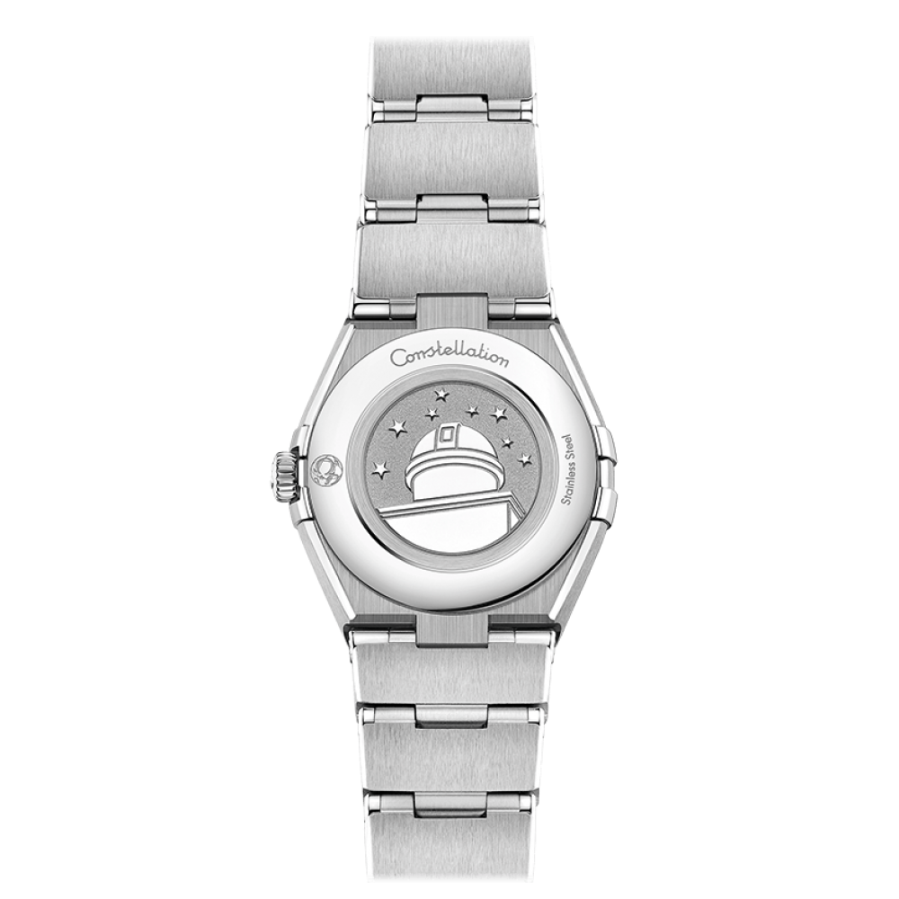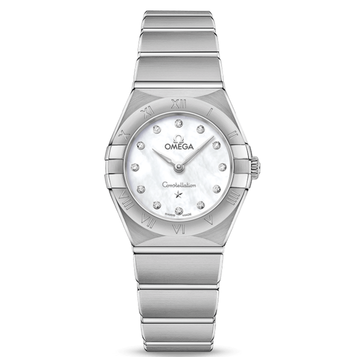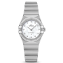 Omega Constellation Quartz 131.10.25.60.55.001 - ladies watch produced by Omega. It has Swiss quartz movement and 4061 calibre. Stainless steel case of round shape. Case dimensions are 25 mm. in diameter and 8.1 mm. in thickness. The dial of this Omega watch is mother of pearl. Display type: analog. This timepiece has sapphire, antireflection coating glass. Stainless steel band, band color: silver. 30 m. water resistance. The watch is from Constellation collection. The following features are equipped: diamond set.