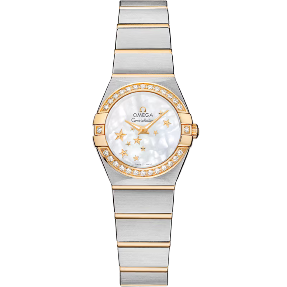 Omega Constellation Quartz 24 mm 123.25.24.60.05.001 - ladies watch manufactured by Omega. It is equipped with Japanese quartz movement and Omega 1376 calibre. Stainless steel, 18k gold case of round shape. Case dimensions are 24 mm. in diameter and 8.07 mm. in thickness. The dial of this Omega watch is mother of pearl. Display type: analog. This timepiece has sapphire, antireflection coating glass. Stainless steel, 18k gold band, band color: silver, gold. 100 m. water resistance. The watch is from Constellation collection. The following features are equipped: glowing hands, diamond set.