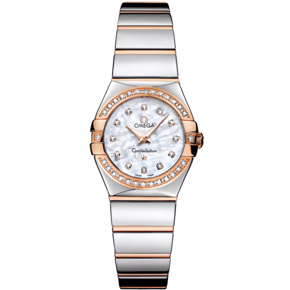 Omega Constellation Quartz 24 mm 123.25.24.60.55.005 - ladies watch manufactured by Omega. It has Japanese quartz movement and Omega 1376 calibre. Stainless steel, 18k red gold case of round shape. Case dimensions are 24 mm. in diameter and 8.07 mm. in thickness. The dial of this Omega watch is mother of pearl. Display type: analog. This timepiece has sapphire, antireflection coating glass. Stainless steel, 18k red gold band, band color: silver, gold. 100 m. water resistance. The watch is from Constellation collection. The following features are equipped: glowing hands, diamond set.