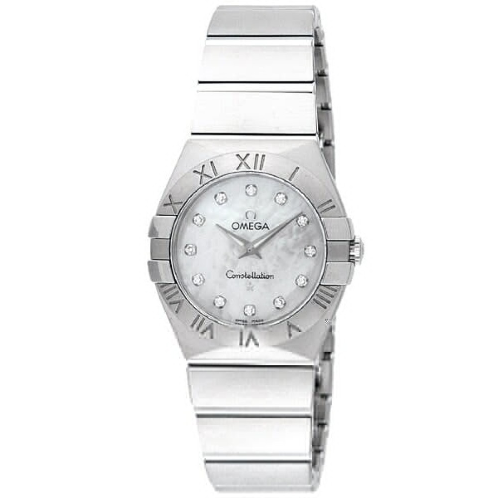 Omega Constellation Quartz 27 mm 123.10.27.60.55.001 - ladies watch produced by Omega. It is equipped with Japanese quartz movement and OMEGA 1376 calibre. Stainless steel case of round shape. Case dimensions are 27 mm. in diameter and 9 mm. in thickness. The dial of this Omega watch is mother of pearl. Display type: analog. This timepiece has sapphire, antireflection coating glass. Stainless steel band, band color: silver. 100 m. water resistance. The watch is from Constellation collection. The following features are equipped: diamond set, glowing hands.
