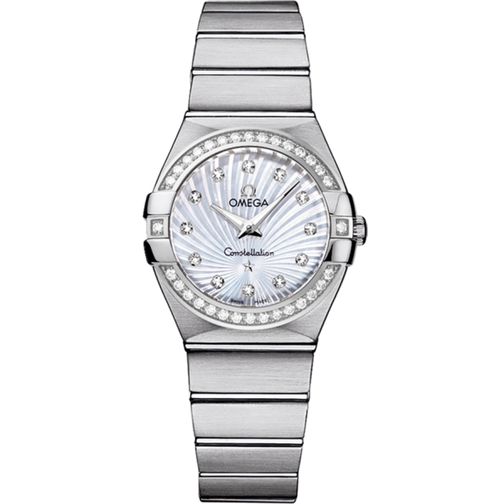 Omega Constellation Quartz 27 mm 123.15.27.60.55.002 - ladies watch manufactured by Omega. It has Japanese quartz movement and OMEGA 1376 calibre. Stainless steel case of round shape. Case dimensions are 27 mm. in diameter and 8.67 mm. in thickness. The dial of this Omega watch is mother of pearl. Display type: analog. This timepiece has sapphire, antireflection coating glass. Stainless steel band, band color: silver. 100 m. water resistance. The watch is from Constellation collection. The following features are equipped: glowing hands, diamond set.