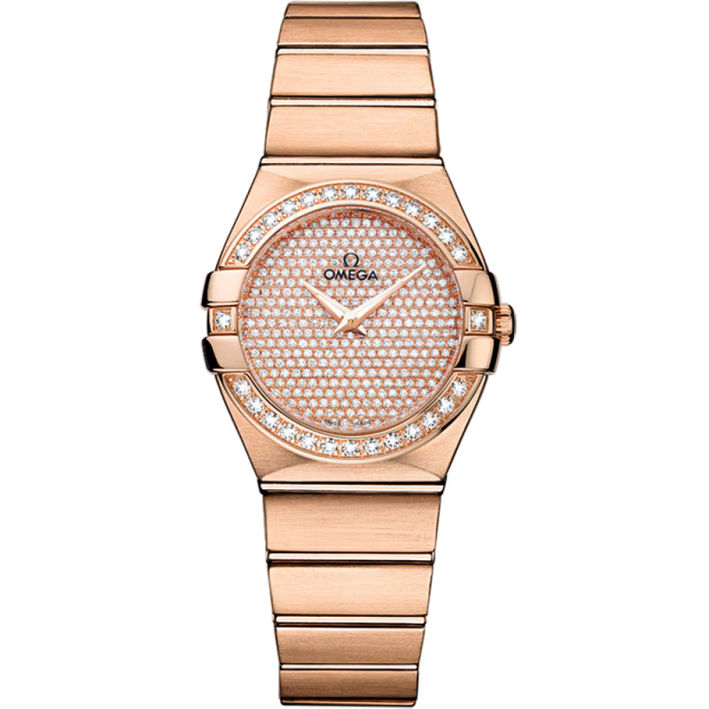 Omega Constellation Quartz 27 mm 123.55.27.60.99.004 - ladies watch produced by Omega. It has Japanese quartz movement and Omega 1376 calibre. 18k pink gold case of round shape. Case dimensions are 27 mm. in diameter and 8.67 mm. in thickness. The dial of this Omega watch is pink gold. Display type: analog. This timepiece has sapphire, antireflection coating glass. 18k pink gold band, band color: gold. 100 m. water resistance. The watch is from Constellation collection. The following features are equipped: glowing hands, diamond set.