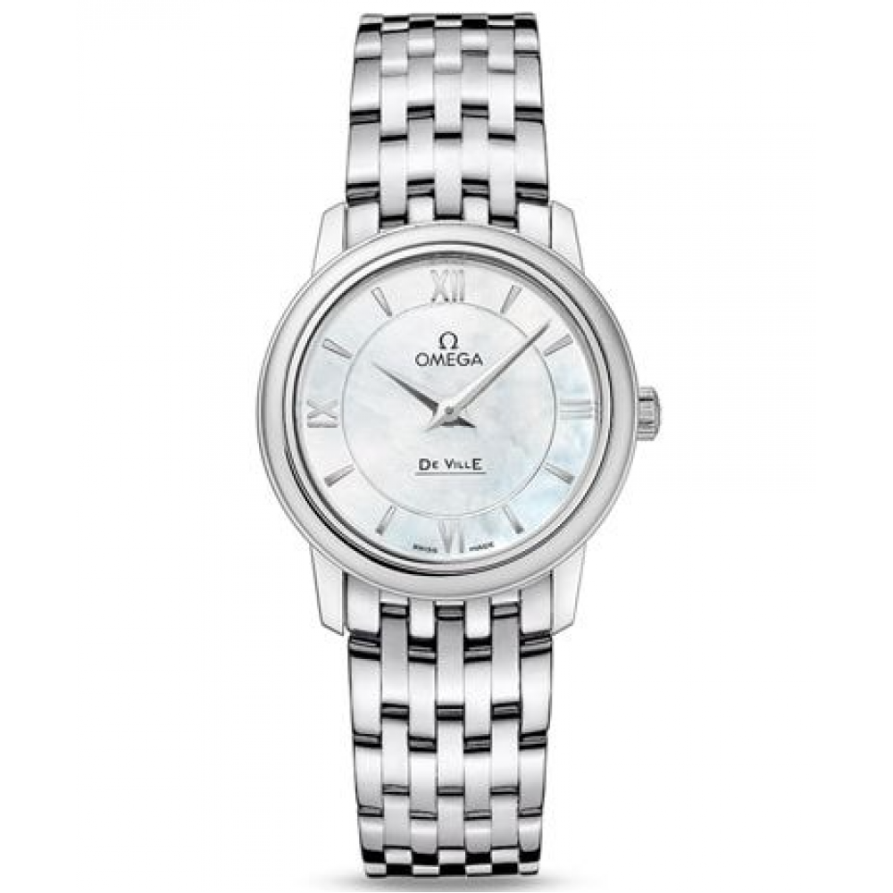 Omega De Ville Prestige Quartz 424.10.27.60.05.001 - ladies watch made by Omega. It is equipped with Swiss quartz movement and 1376 calibre. Stainless steel case of round shape. Case dimensions are 27.4 mm. in diameter and 6.6 mm. in thickness. The dial of this Omega watch is mother of pearl. Display type: analog. This timepiece has sapphire, antireflection coating glass. Stainless steel band, band color: silver. 30 m. water resistance. The watch is from De Ville collection.