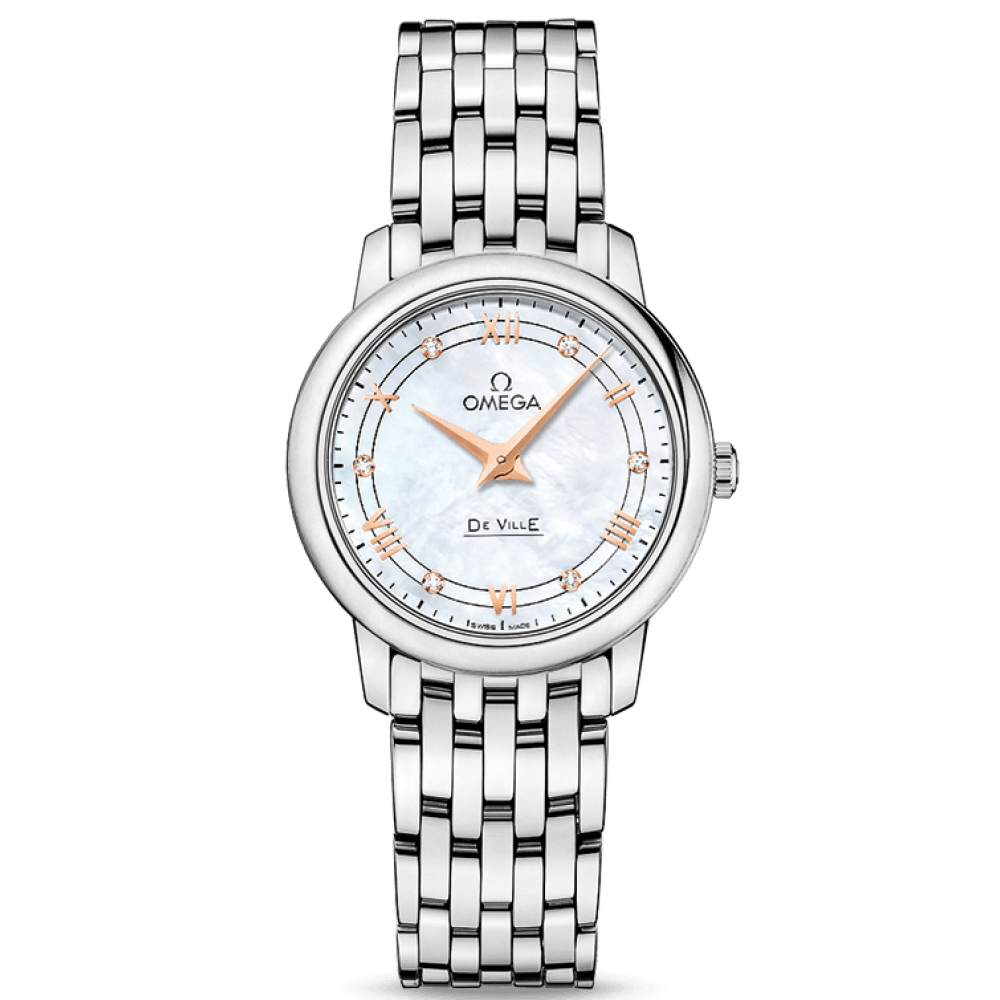 Omega De Ville Prestige Quartz 424.10.27.60.55.001 - ladies watch produced by Omega. It is equipped with Swiss quartz movement and 1376 calibre. Stainless steel case of round shape. Case dimensions are 27.4 mm. in diameter and 6.6 mm. in thickness. The dial of this Omega watch is mother of pearl. Display type: analog. This timepiece has sapphire, antireflection coating glass. Stainless steel band, band color: silver. 30 m. water resistance. The watch is from De Ville collection. The following features are equipped: diamond set.