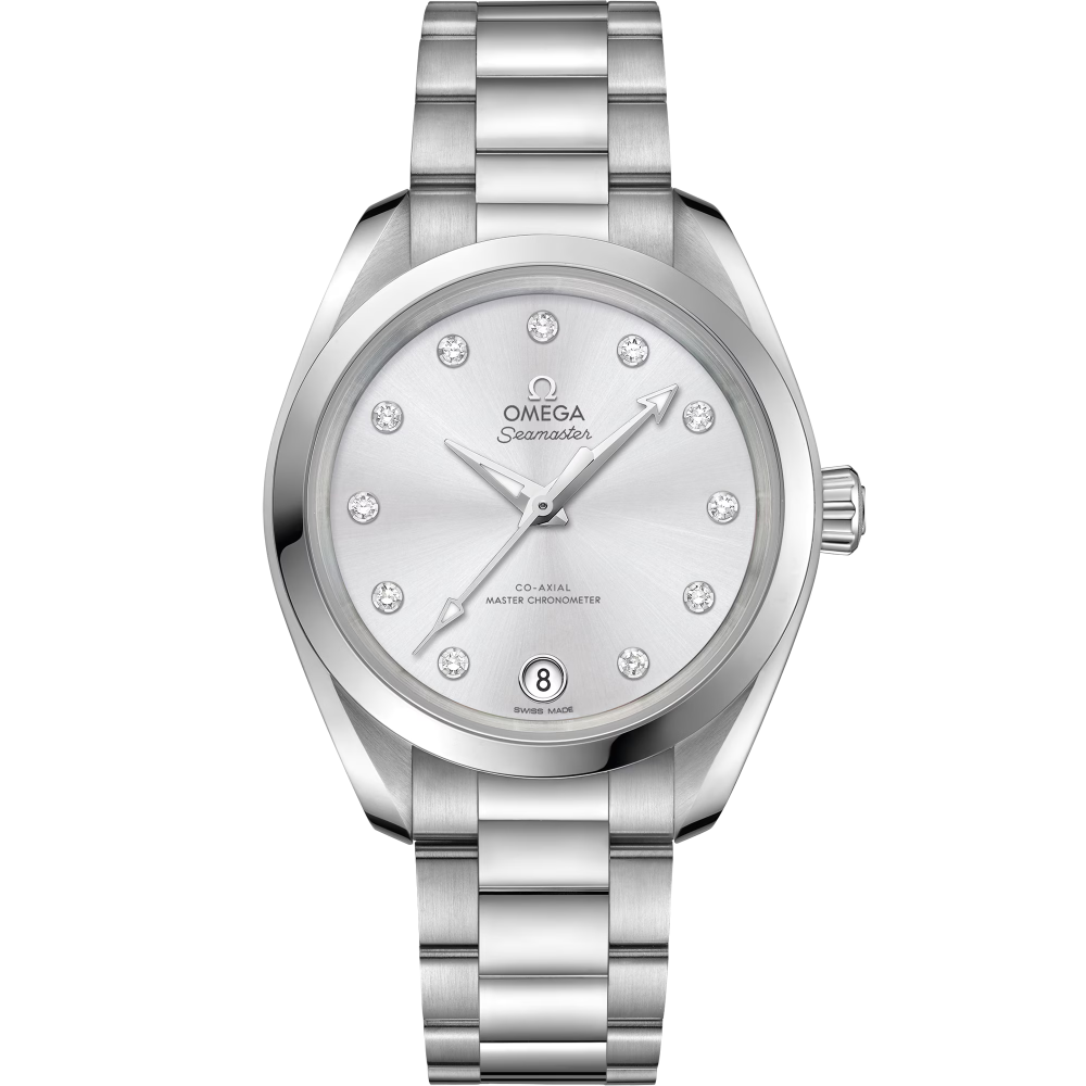 Omega Seamaster Aqua Terra 150m Co-Axial Master Chronometer 34 mm 220.10.34.20.60.001 - ladies watch manufactured by Omega. It is equipped with Japanese automatic movement and Omega 8800 calibre. Stainless steel case of round shape. Case dimensions are 34 mm. in diameter and 11.83 mm. in thickness. The dial of this Omega watch is silver. Display type: analog. This timepiece has sapphire, antireflection coating glass. Stainless steel band, band color: silver. 150 m. water resistance. The watch is from Seamaster collection. The following features are equipped: antimagnetic, chronometer, date, glowing hands, diamond set.