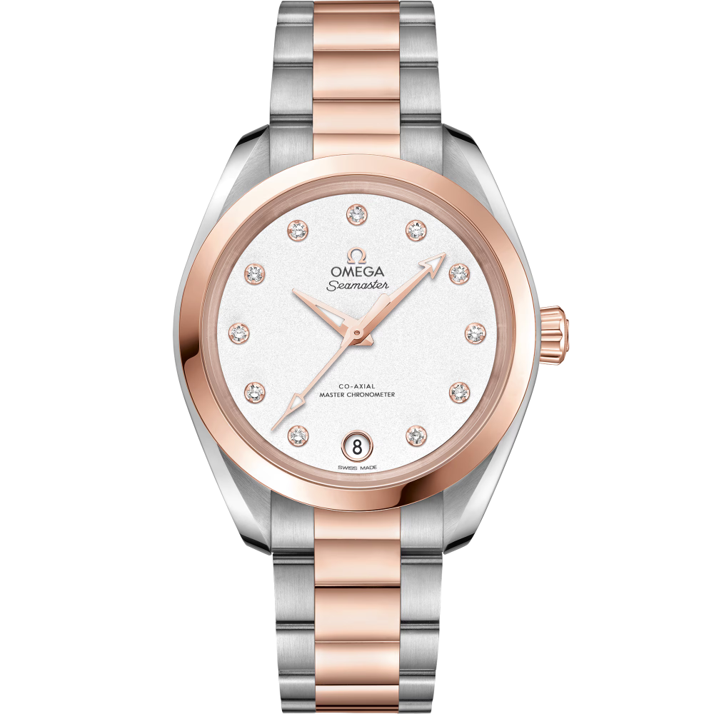 Omega Seamaster Aqua Terra 150m Co-Axial Master Chronometer 34 mm 220.20.34.20.52.001 - ladies watch made by Omega. It is equipped with Japanese automatic movement and Omega 8800 calibre. Stainless steel, 18k sedna™ gold case of round shape. Case dimensions are 34 mm. in diameter and 11.83 mm. in thickness. The dial of this Omega watch is white. Display type: analog. This timepiece has sapphire, antireflection coating glass. Stainless steel, 18k sedna™ gold band, band color: silver, gold. 150 m. water resistance. The watch is from Seamaster collection. The following features are equipped: antimagnetic, chronometer, glowing hands, date, diamond set.