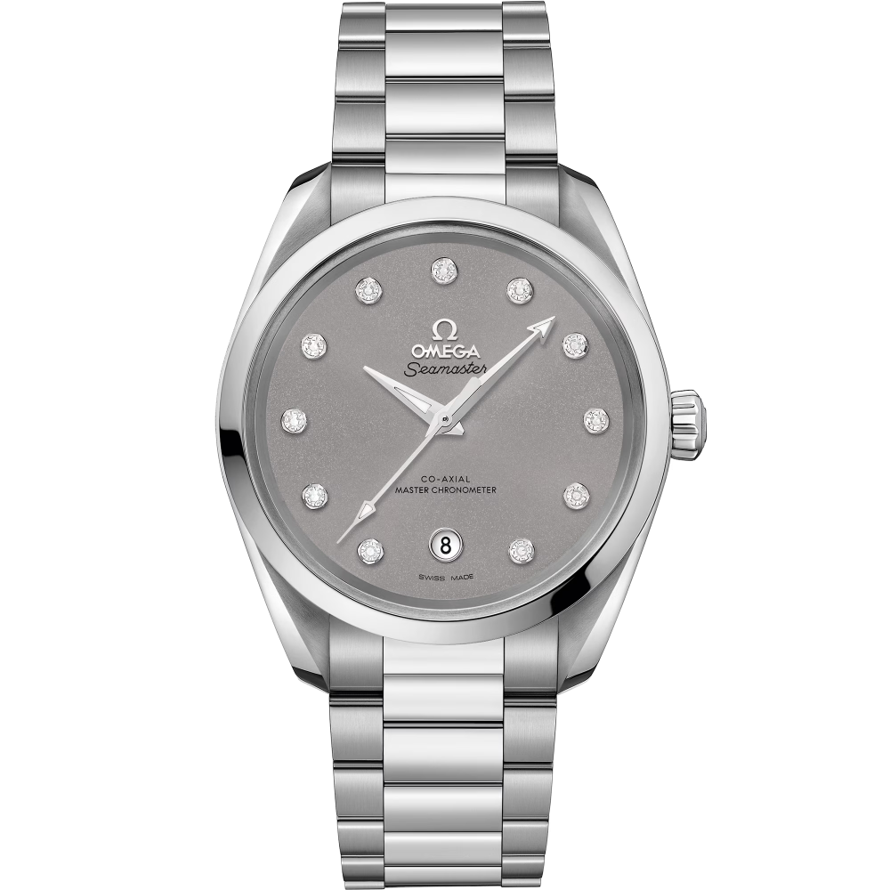 Omega Seamaster Aqua Terra 150m Co-Axial Master Chronometer 38 mm 220.10.38.20.56.001 - ladies watch produced by Omega. It has Japanese automatic movement and Omega 8800 calibre. Stainless steel case of round shape. Case dimensions are 38 mm. in diameter and 12.26 mm. in thickness. The dial of this Omega watch is gray. Display type: analog. This timepiece has sapphire, antireflection coating glass. Stainless steel band, band color: silver. 150 m. water resistance. The watch is from Seamaster collection. The following features are equipped: antimagnetic, chronometer, glowing hands, date, diamond set.