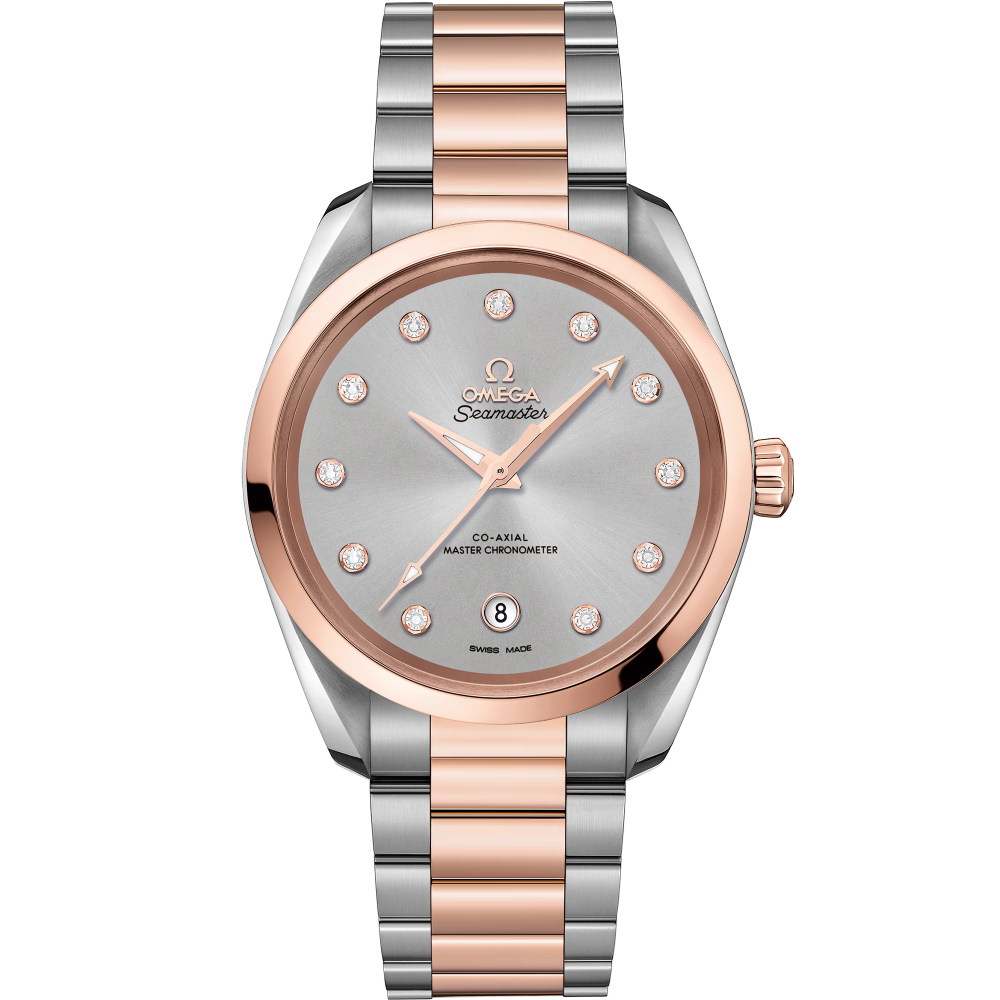 Omega Seamaster Aqua Terra 150m Co-Axial Master Chronometer 38 mm 220.20.38.20.56.002 - men's watch produced by Omega. It is equipped with Japanese automatic movement and Omega 8800 calibre. Stainless steel, 18k sedna™ gold case of round shape. Case dimensions are 38 mm. in diameter and 12.26 mm. in thickness. The dial of this Omega watch is gray. Display type: analog. This timepiece has sapphire, antireflection coating glass. Stainless steel, 18k sedna™ gold band, band color: silver, gold. 150 m. water resistance. The watch is from Seamaster collection. The following features are equipped: antimagnetic, chronometer, glowing hands, date, diamond set.