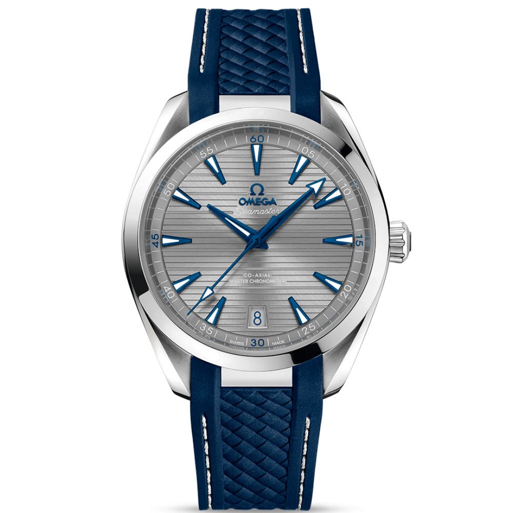 Omega Seamaster Aqua Terra 150M Master Chronometer 220.12.41.21.06.001 - men's watch manufactured by Omega. It is equipped with Swiss automatic movement and 8900 calibre. Stainless steel case of round shape. Case dimensions are 41 mm. in diameter and 13.2 mm. in thickness. The dial of this Omega watch is gray. Display type: analog. This timepiece has sapphire, antireflection coating glass. Rubber band, band color: blue. 150 m. water resistance. The watch is from Seamaster collection. The following features are equipped: chronometer, date, antimagnetic, screw-down crown, glowing hands, glowing markers.